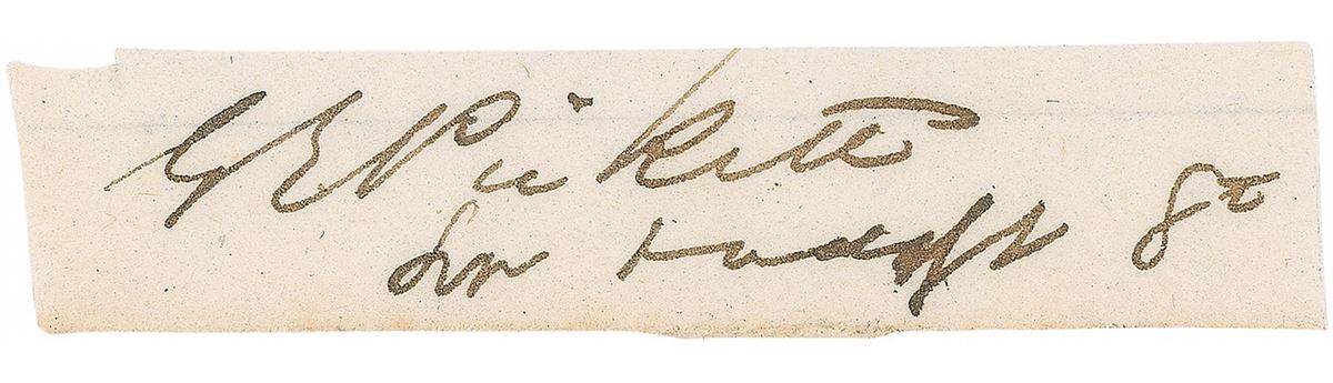 Virginia-born Confederate officer (1825–1875) who famously led the eponymous ill-fated charge at Gettysburg. Scarce ink signature, “G. E. Pickett, Lt r adjt 8th,” on an off-white 2 x .5 slip. In fine condition, with closely cropped edges. A clean and highly sought-after example.