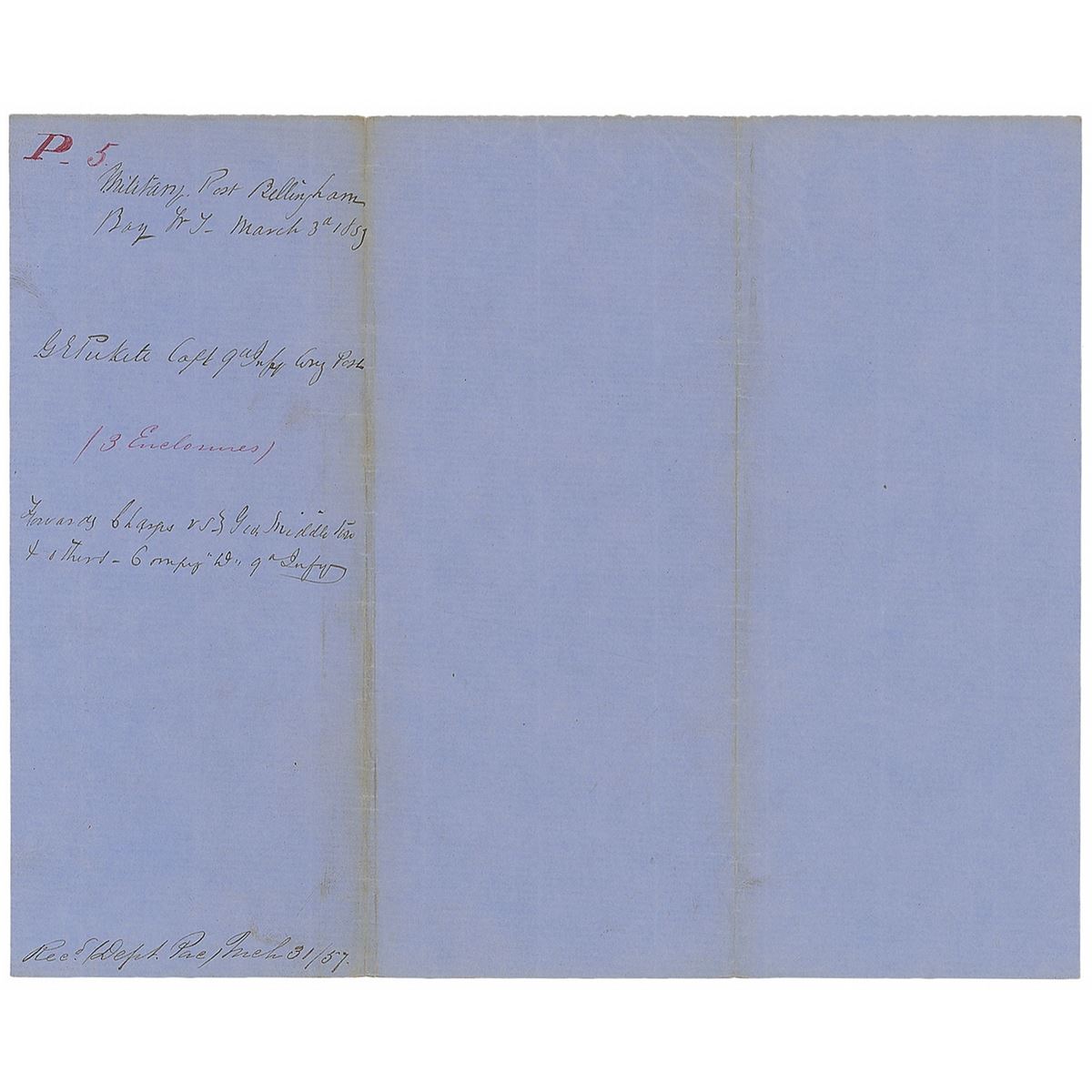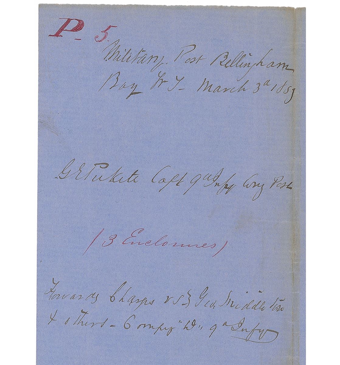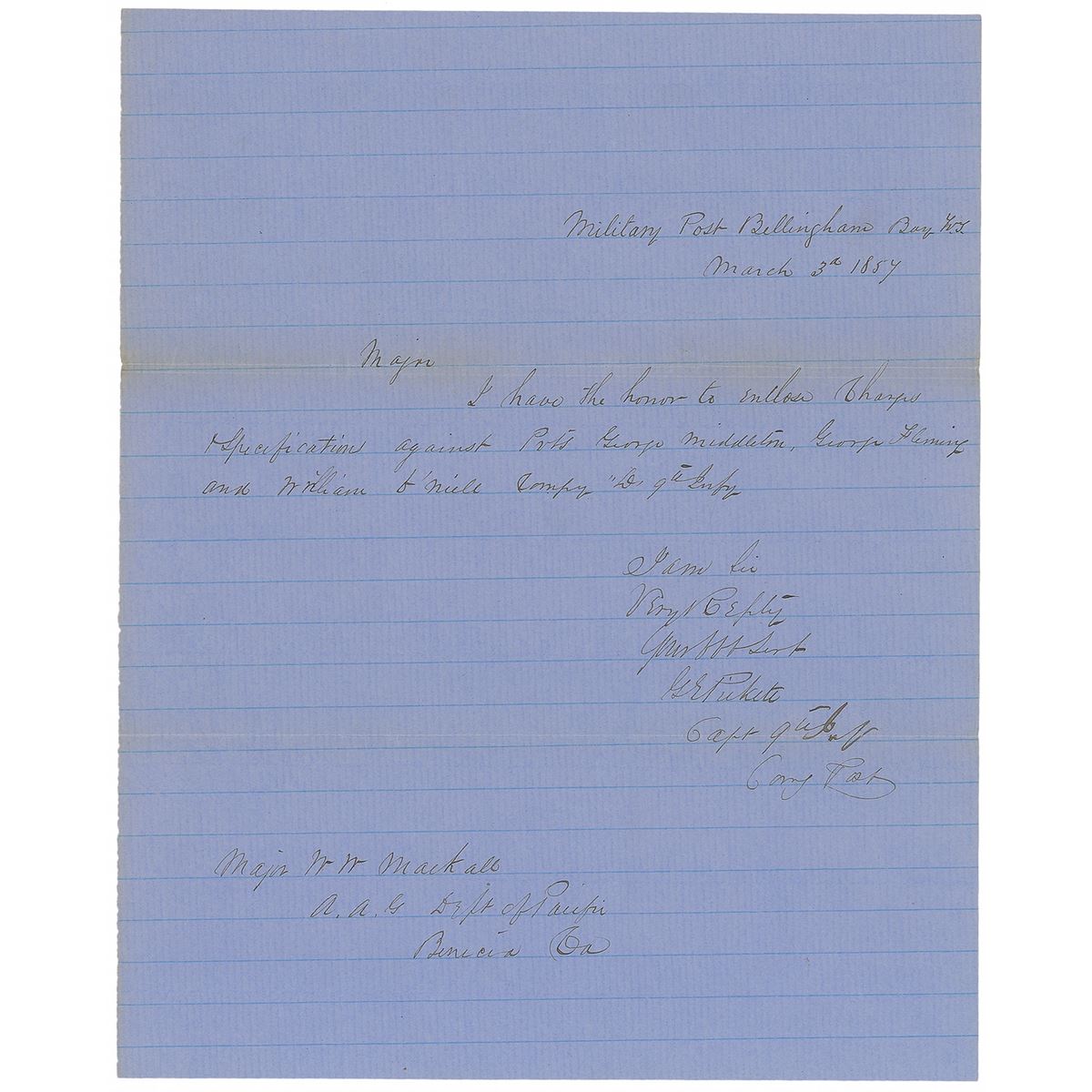 Virginia-born Confederate officer (1825–1875) who famously led the eponymous ill-fated charge at Gettysburg. Twice-signed ALS signed “G. E. Pickett, Capt. 9th Infy, Comg Post,” one page, 7.75 x 9.75, March 3, 1857. Letter to Major W. W. Mackall, penned from “Military Post Bellingham.” In full: “I have the honor to enclose charges and specifications against Pvts. George Middleton, George Fleming, and William O'Neill Comp'y ‘D’ 9th Infy.” Also endorsed on the reverse entirely in Pickett’s hand and signed in the same manner: “Military Post Bellingham Bay WT, March 3, 1857, G. E. Pickett Capt. 9th Infy Comg Post, Forwarding Charges vs. Geo. Middleton & others, Company ‘D’ 9th Infy.” In fine condition, with a light band of toning along upper horizontal fold. Pickett oversaw the construction of Fort Bellingham, situated in the northwest corner of the Washington Territory near the Canadian border. beginning in August 1856. He remained there with the 9th Infantry for three years, where they were tasked with fighting Indians on the frontier and defending the border, Pickett established a reputation for harsh discipline out of necessity, as his unruly soldiers were prone to desertion, drunkenness, and petty crimes. A scarce letter associated with Pickett’s experience during his early command.