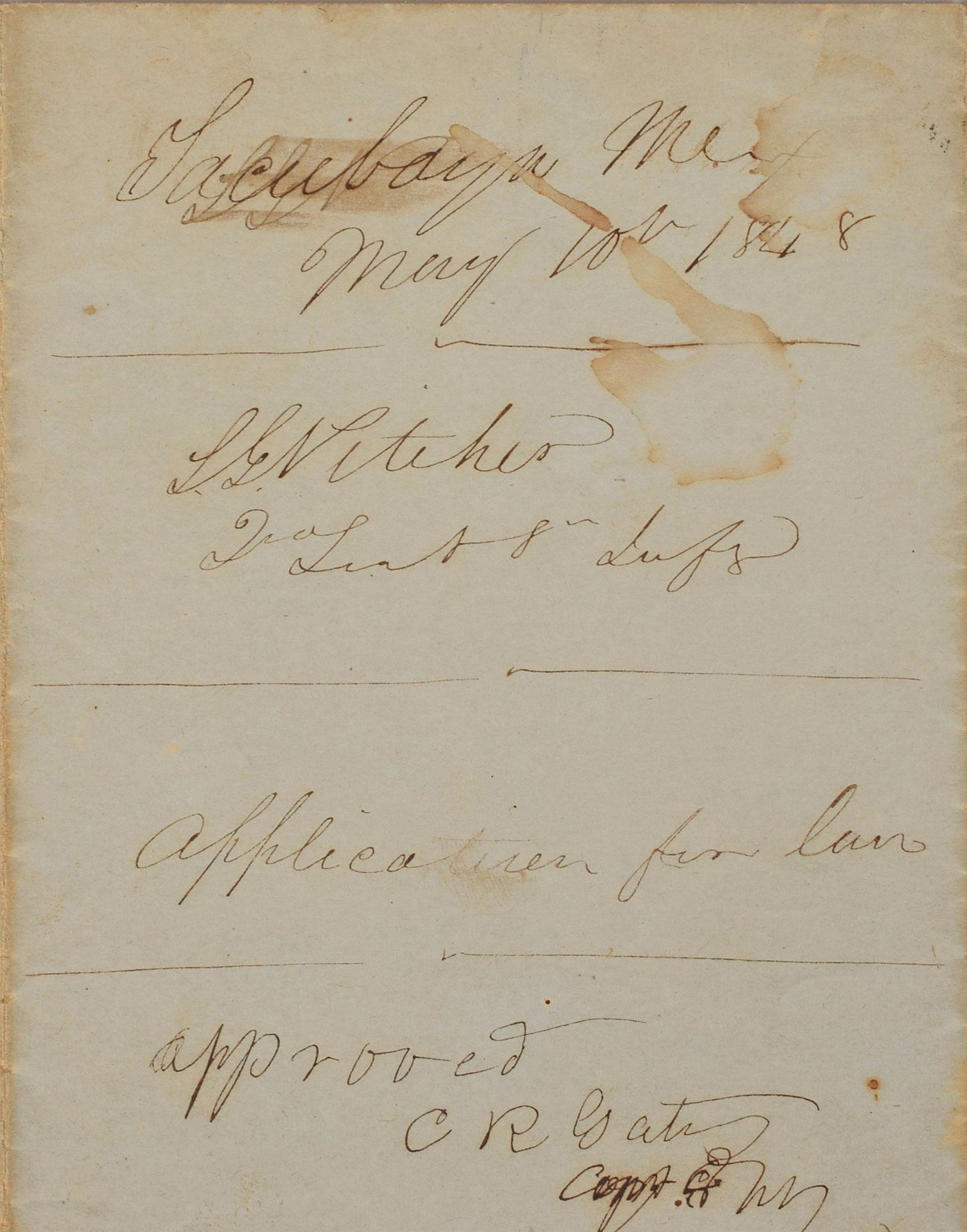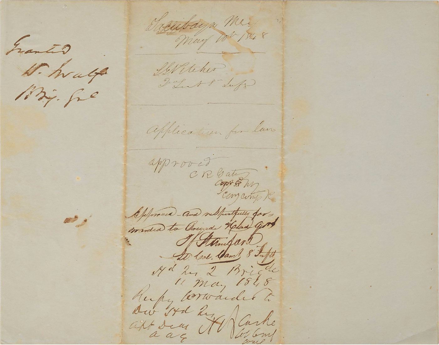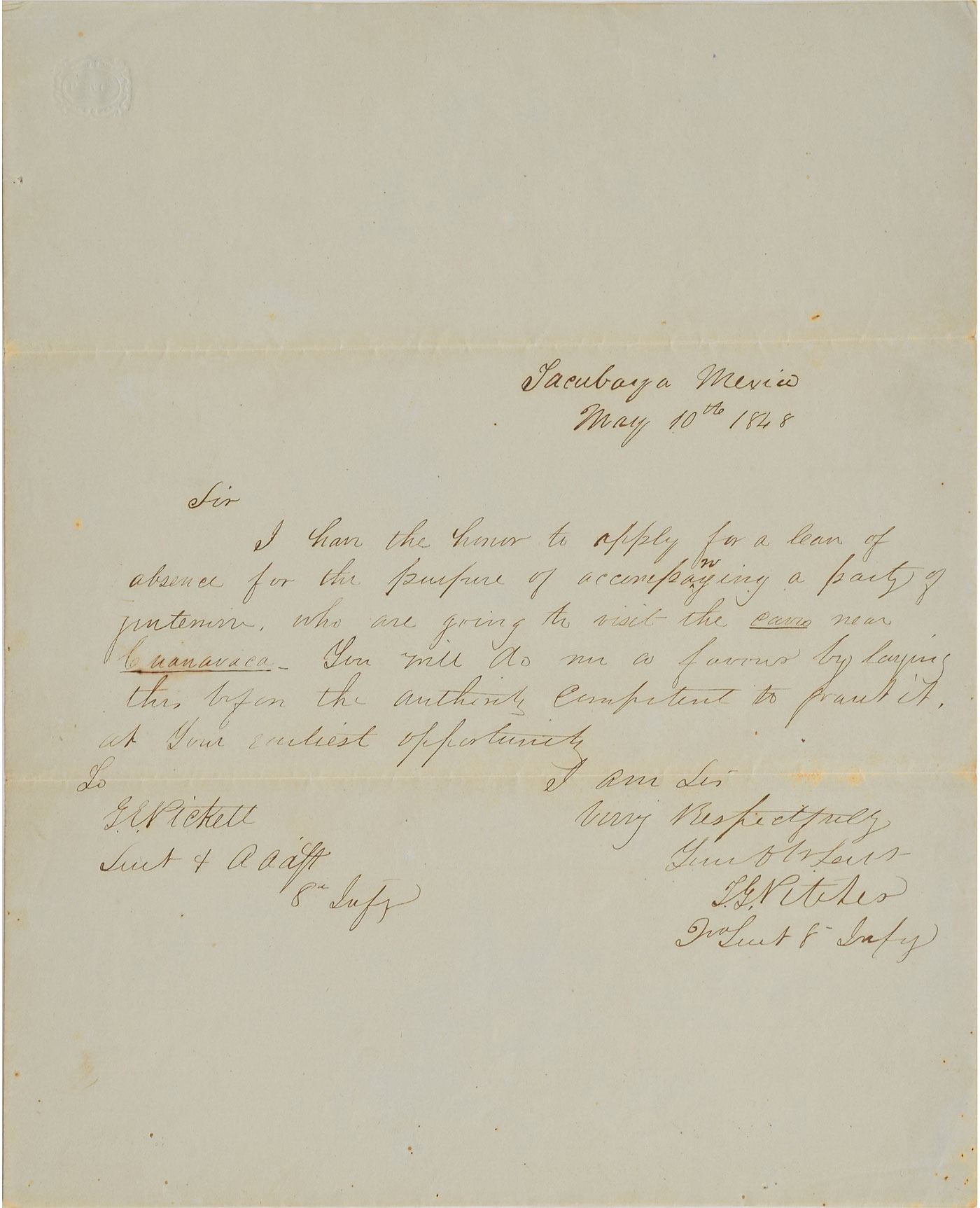 Handwritten endorsement penned on the reverse of a letter sent to him by 2nd Lieutenant Thomas Gamble Pitcher, one page, 7.75 x 9.75, May 10, 1848. Pitcher writes, in full "I have the honor to apply for a leave of absence for the purpose of accompanying a party of gentlemen, who are going to visit the cavo near Cuanavaca. You will do me a favour by laying this before the authority competent to grant it, at your earliest opportunity." Pickett adds his endorsement on the reverse docketing: "Tacubaya, Mex May 10th 1848 T E. Pitcher 2nd Lieut 8th Infantry Application for leave." The leave was approved with the help of Captain Collinson R. Gates. In very good to fine condition, with light staining affecting the first few words, and light toning along folds.