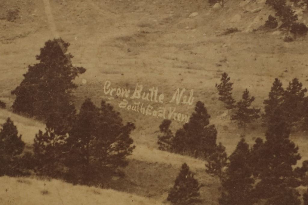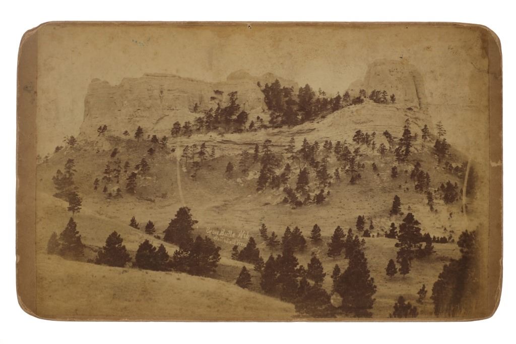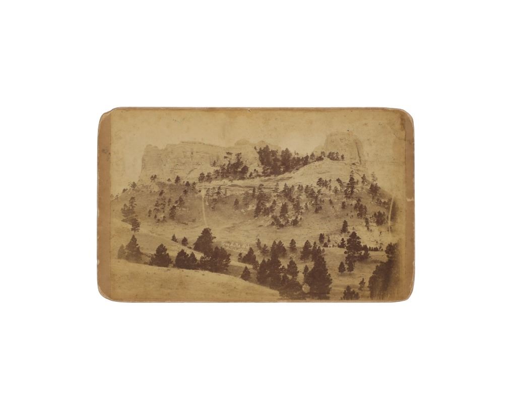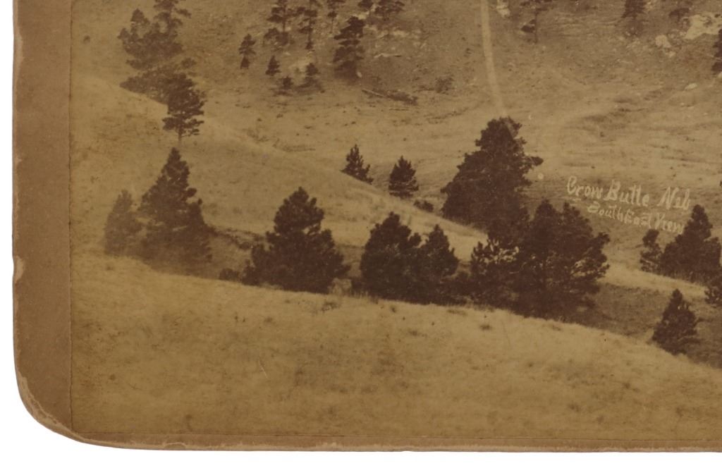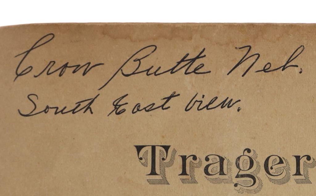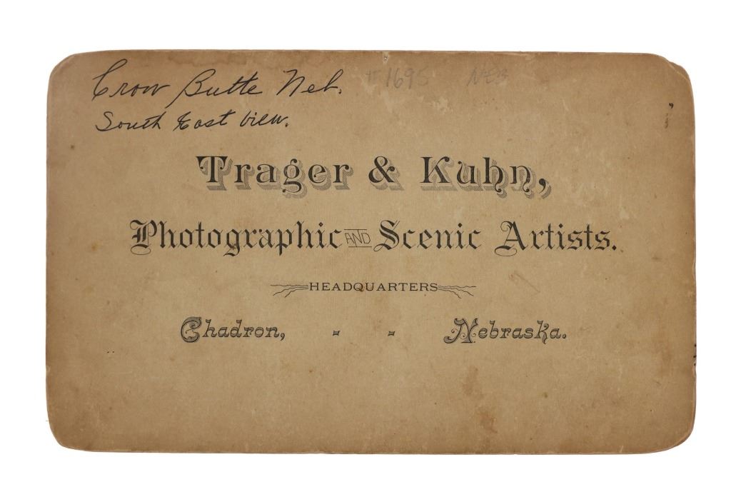 This is an original photograph of Crow Butte Nebraska done in the late 19th Century by Trager & Kuhn Chadron, Nebraska. George E. Trager (1861-1948) was born in Germany in 1861 and arrived in America in 1876. He started his first photography in 1888 with Frederick Kuhn in Mazomanie, Wisconsin. The next year, 1889, they moved to Chadron, Nebraska and purchased the Bon Ton Art Gallery from Alice Luce. George Trager was the first photographer at the Wounded Knee Massacre. This piece is marked in the negative, “Crow Butte Neb South East View” showing the beautiful Butte on a large format photograph on a boudoir card. The back is marked as Trager & Kuhn, Photographic and Scenic Artists Chadron, Nebraska and written on Crow Butte Neb. South East View #1695 NEB. Provenance: From the Jim Aplan Piedmont, South Dakota collection. Measures 8.5” x 5.25”. Image is beautiful, some wear, corners worn on card, small hole at the top, but overall fair.