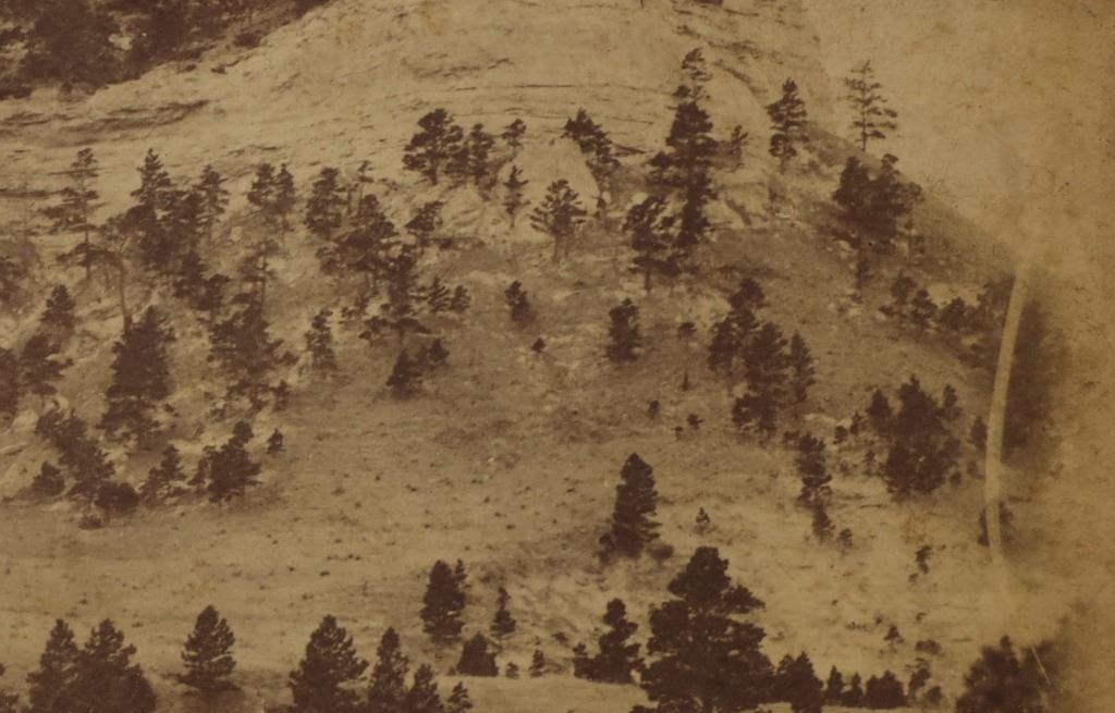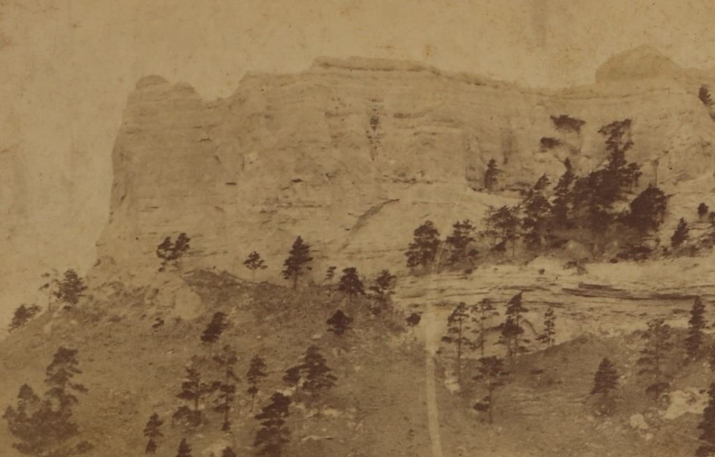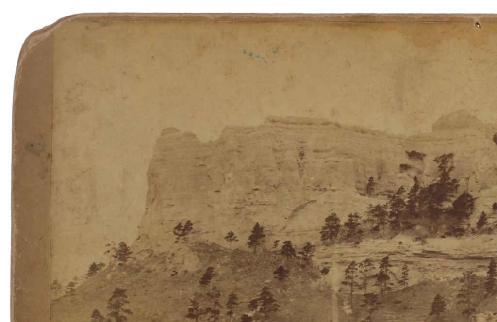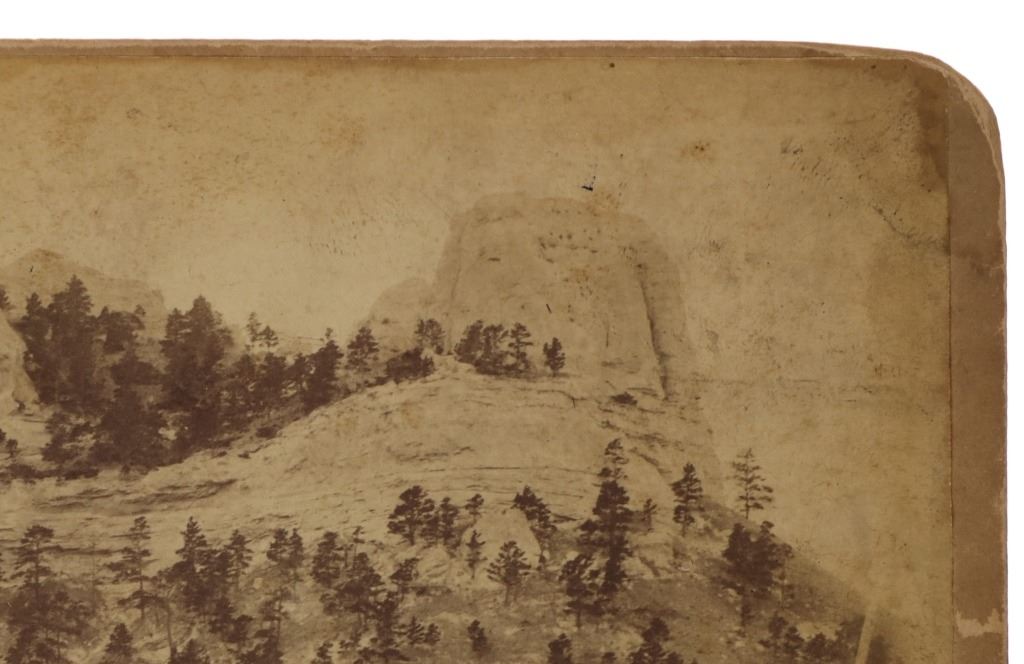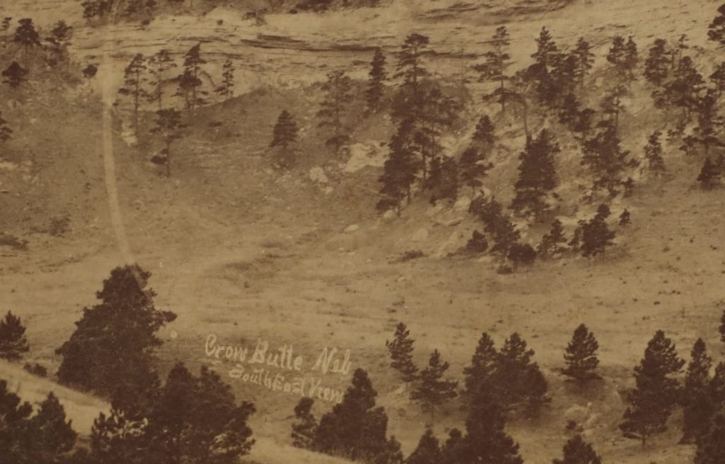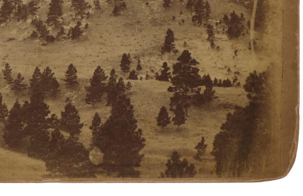 This is an original photograph of Crow Butte Nebraska done in the late 19th Century by Trager & Kuhn Chadron, Nebraska. George E. Trager (1861-1948) was born in Germany in 1861 and arrived in America in 1876. He started his first photography in 1888 with Frederick Kuhn in Mazomanie, Wisconsin. The next year, 1889, they moved to Chadron, Nebraska and purchased the Bon Ton Art Gallery from Alice Luce. George Trager was the first photographer at the Wounded Knee Massacre. This piece is marked in the negative, “Crow Butte Neb South East View” showing the beautiful Butte on a large format photograph on a boudoir card. The back is marked as Trager & Kuhn, Photographic and Scenic Artists Chadron, Nebraska and written on Crow Butte Neb. South East View #1695 NEB. Provenance: From the Jim Aplan Piedmont, South Dakota collection. Measures 8.5” x 5.25”. Image is beautiful, some wear, corners worn on card, small hole at the top, but overall fair.