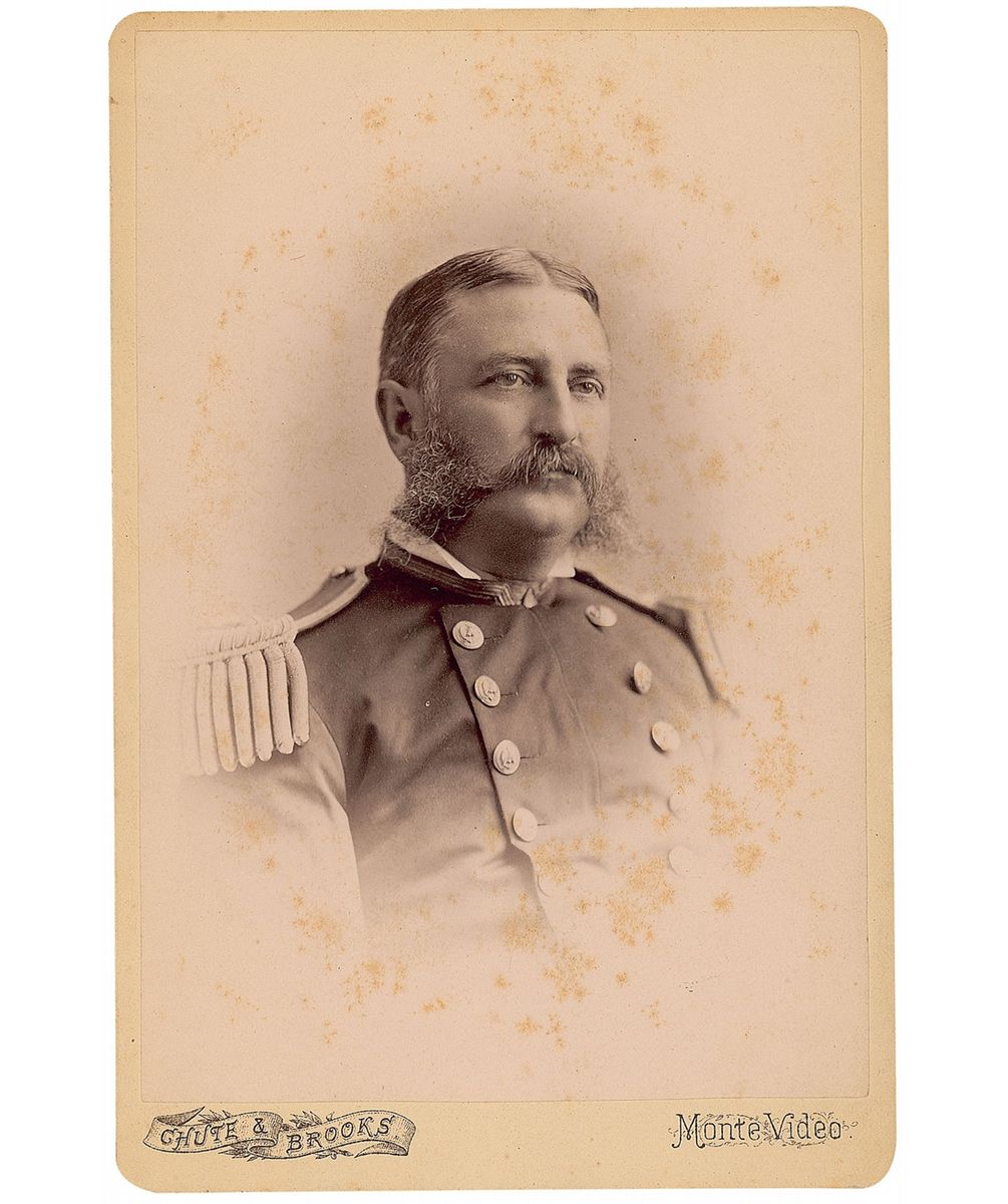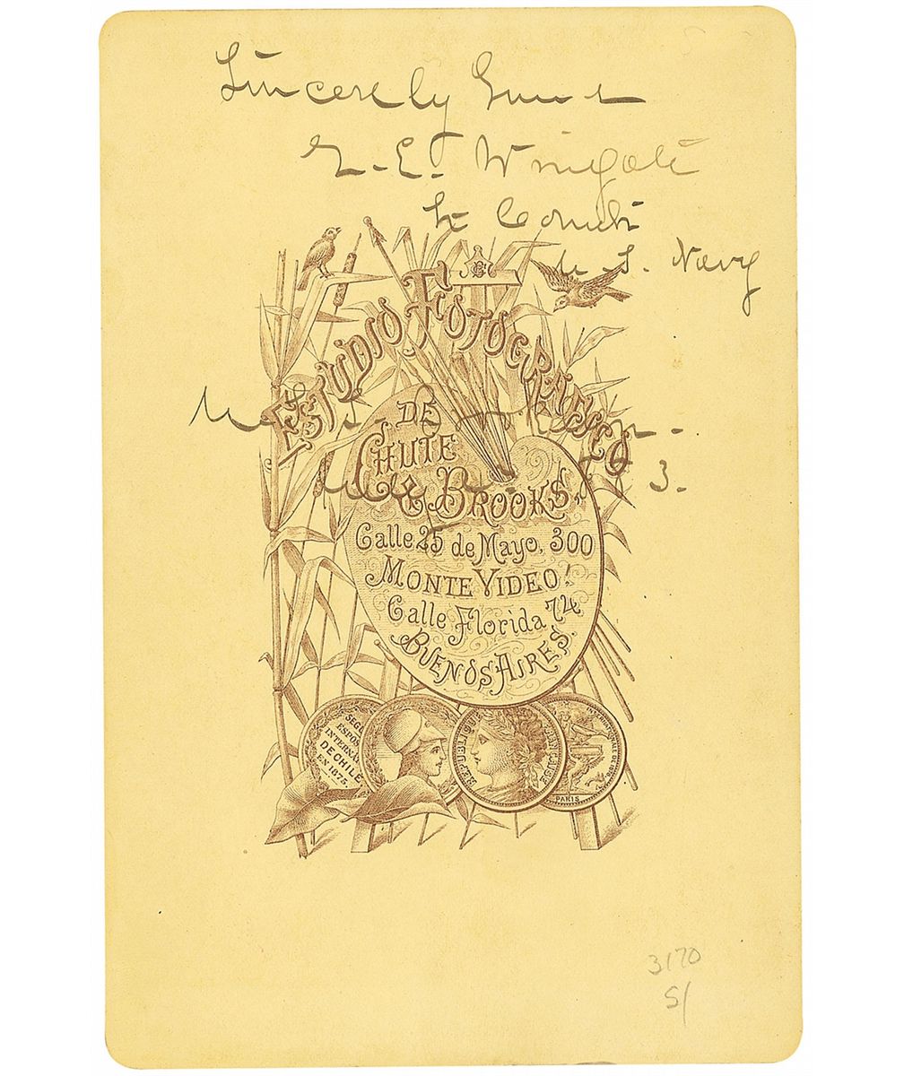 Union naval officer who served in both the East and West Blockading Squadrons. Original 4 x 6.5 cabinet photo by Chute and Brooks of Buenos Aires, signed on the reverse in black ink, “Sincerely yours, G. E. Wingate, Lt. Comdr, U. S. Navy, U.S.S. Brooklyn 1883.” Mild foxing to image and moderate contrast to last couple of lines of Wingate’s writing, otherwise fine condition.