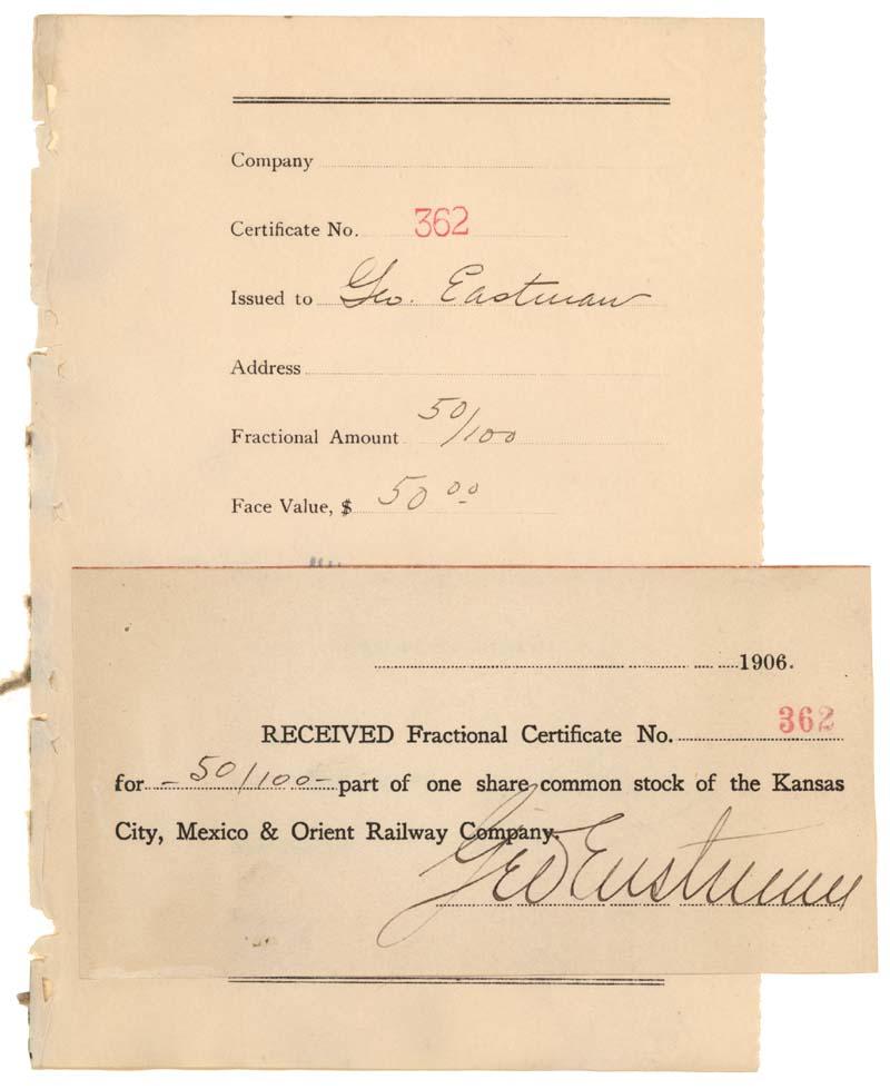 GEORGE EASTMAN (1854-1932) Founder of Eastman Kodak Company and inventor of roll film. Stock certificate transfer stub Signed, "Geo. Eastman." Very Fine.