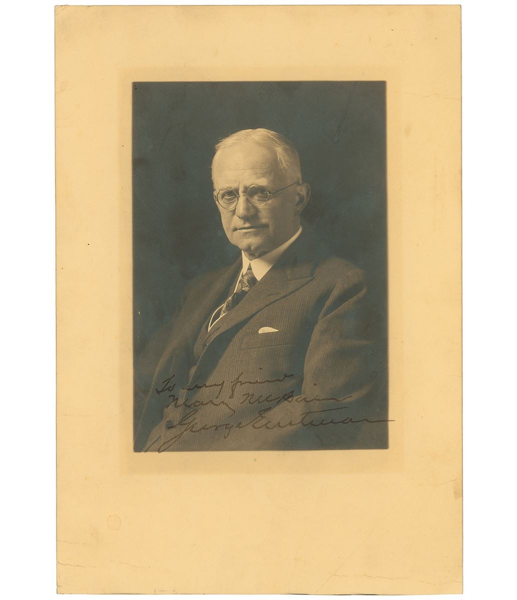 American inventor, entrepreneur, and founder of the Eastman Kodak company (1854–1932) whose invention of roll film helped revolutionize photography. Distinguished vintage matte-finish 6.25 x 9 half-length portrait of Eastman, signed and inscribed in fountain pen, “To my friend, Mary McBain, George Eastman.” Housed in its original Arthur Studios of New York presentation folder. Light scattered creasing and soiling, some slight silvering, and fair contrast to the signature against the dark background, otherwise fine condition.