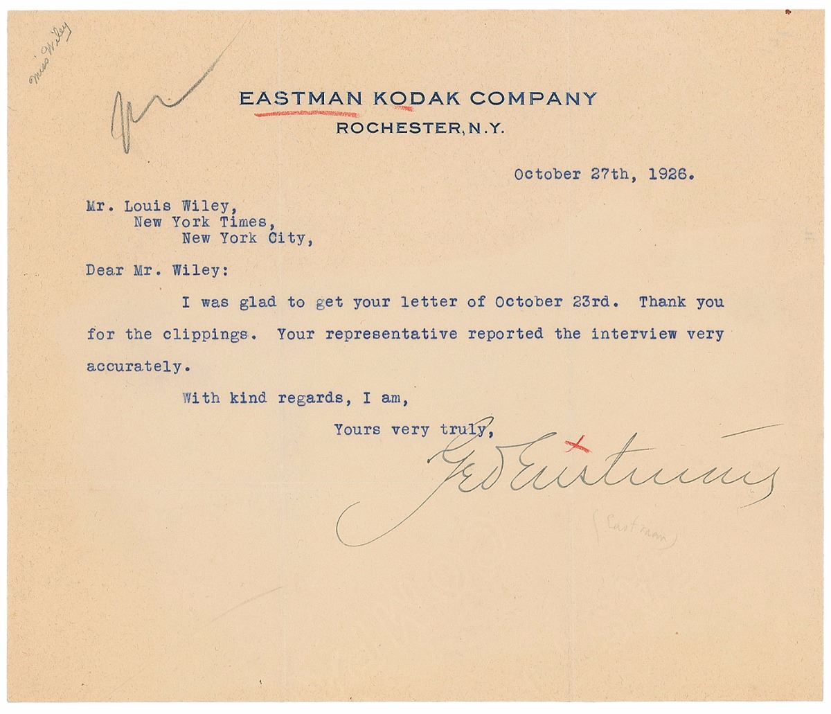 American inventor, entrepreneur, and founder of the Eastman Kodak company (1854–1932) whose invention of roll film helped revolutionize photography. TLS signed “Geo. Eastman,” one page, 8.5 x 7.25, Eastman Kodak Company letterhead, October 27, 1926. Letter to Louis Wiley, former business manager of the New York Times, in full: “I was glad to get your letter of October 23rd. Thank you for the clippings. Your representative reported the interview very accurately.” In fine condition, with intersecting folds (passing through portions of the signature), and a trimmed bottom edge and a few pencil notations.