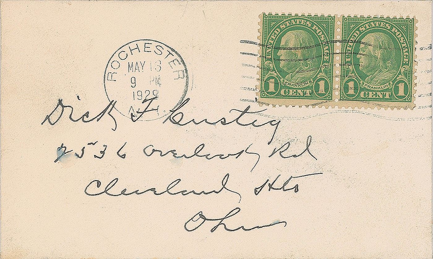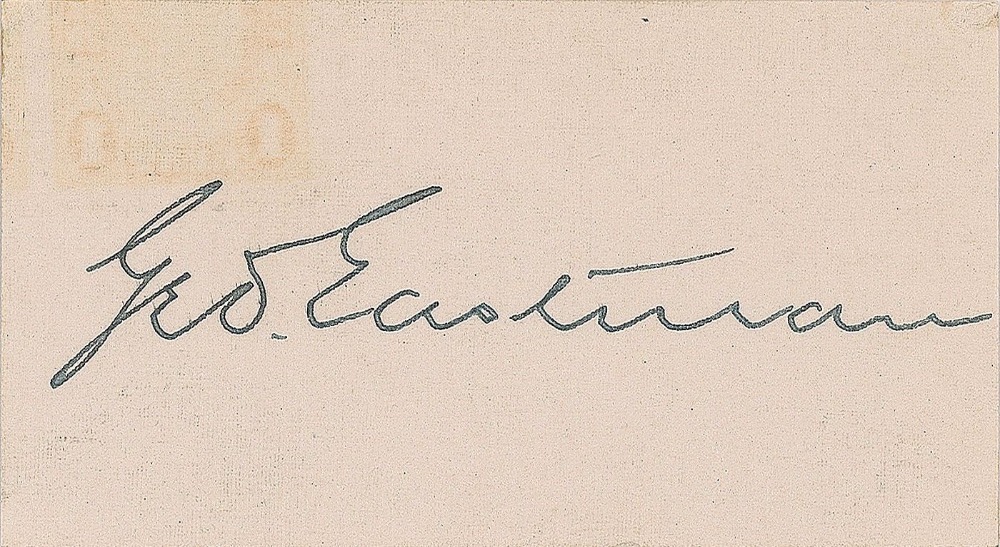 Fountain pen signature, "Geo. Eastman,” on an off-white 3 x 1.5 slip. In fine condition, with a faint stain above his first name from onetime contact with a postage stamp. Accompanied by the original mailing envelope addressed in Eastman's hand, postmarked at Rochester in 1929.
