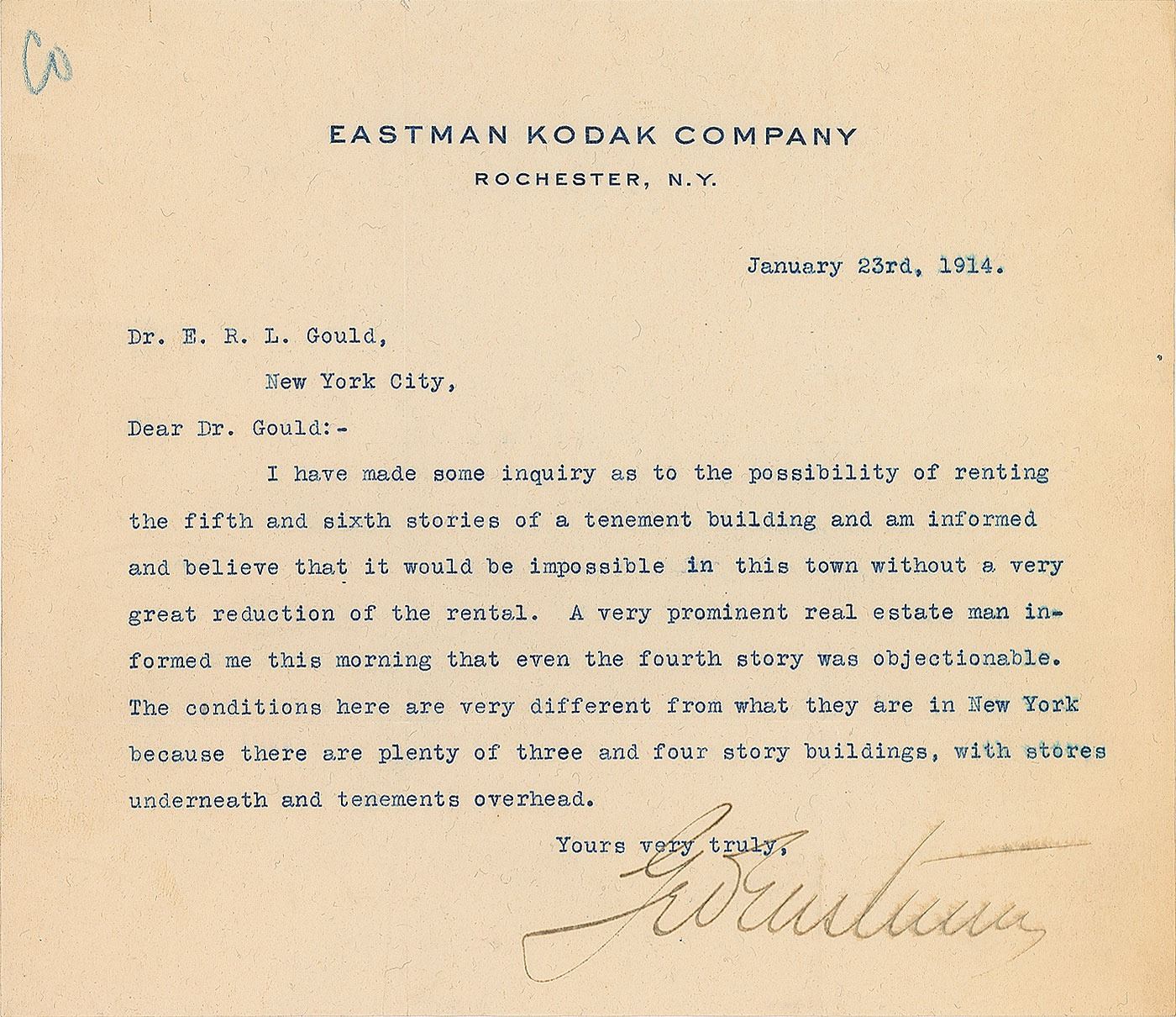 TLS signed “Geo. Eastman,” one page, 8.5 x 7.25, Eastman Kodak Company letterhead, January 23, 1914. Letter to E. R. L. Gould, in full: "I have made some inquiry as to the possibility of renting the fifth and sixth stories of a tenement building and am informed and believe that it would be impossible in this town without a very great reduction of the rental. A very prominent real estate man informed me this morning that even the fourth story was objectionable. The conditions here are very different from what they are in New York because there are plenty of three and four story buildings, with stores underneath and tenements overhead." In very good to fine condition, with intersecting folds and scattered light wrinkling.