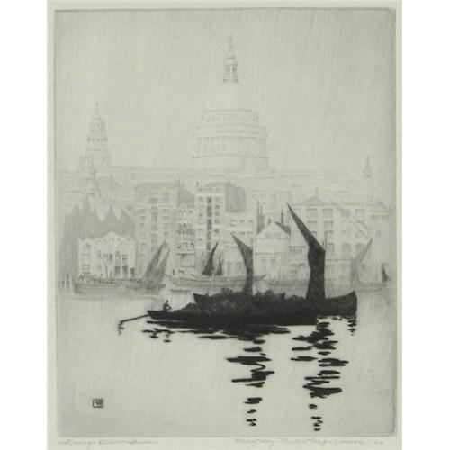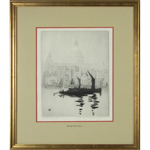 George Elbert Burr (1859-1939) Drypoint Etching, "Misty Day, Pauls Wharf, London", image size 9 7/8" x 7 7/8", pencil signed, circa 1905, Seeber #276