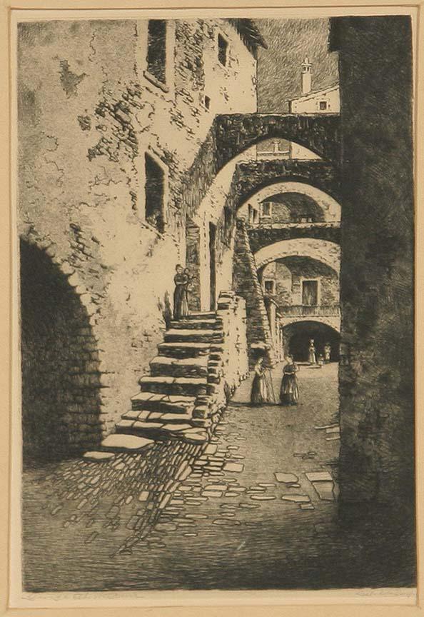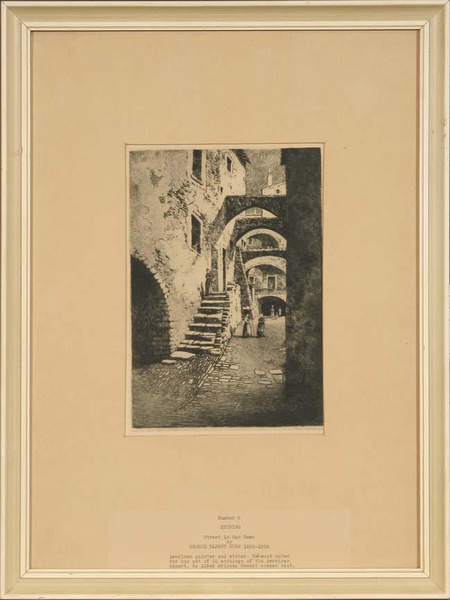 George Elbert Burr (1859-1939). Street In San Remo. 9 ¾" x 6 ½" etching. Pencil signed lower left margin. "Del et Imp" lower right margin. (est $600-900). Provenance: Bethany College, Lindsborg, KS. . For condition reports please visit: www.auctioninsantafe.com/cr2011.pdf