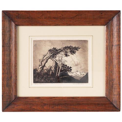 George Elbert Burr etching, "Home of the Winds", signed, matted, held in an Arts & Crafts oak frame, 7" x 5.5"