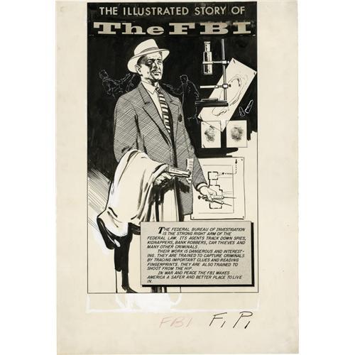 <B>George Evans (attributed) - The World Around Us #6, "The F.B.I." Splash Page Original Art (Gilberton, 1960).</B></I> George Evans' realistic cartooning brings the history of the F.B.I to life. This intrepid agent has a .45 in one hand and a fistful of hypodermic needles in the other -- and this piece was done post-Comic Code -- that would be a no-no, except that the Gilberton didn't submit to the Code. This page has an image area of 10.5" x 18", and the art is in Excellent condition.