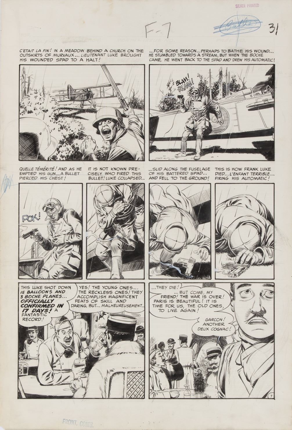 31. George Evans original artwork for Front Line Combat #13 original 7-page story "Frank Luke!". (EC, 1953) Accomplished in pencil and ink on 15 x 22 in. Bristol art board. There's no doubt that George Evans was the definitive artist to depict early aviation, a personal, life-long passion. So it was natural for Harvey Kurtzman, who wrote this story, to give it to George. Featuring glorious panels filled with WWI aerial battles and intrigue! In very good condition. $3,000 - $5,000
