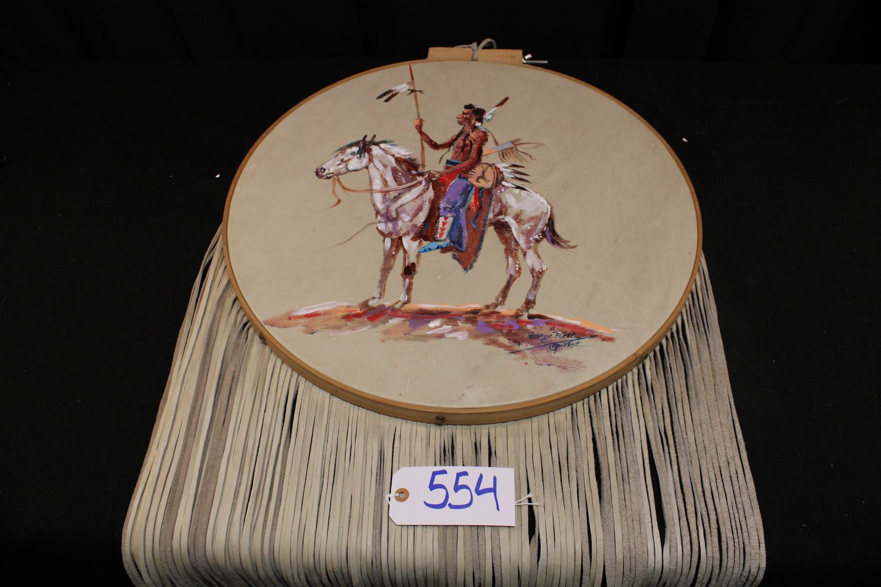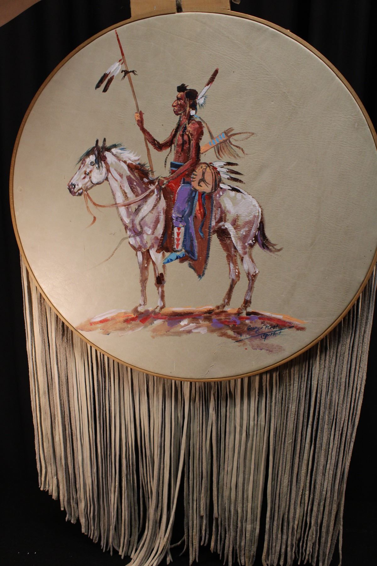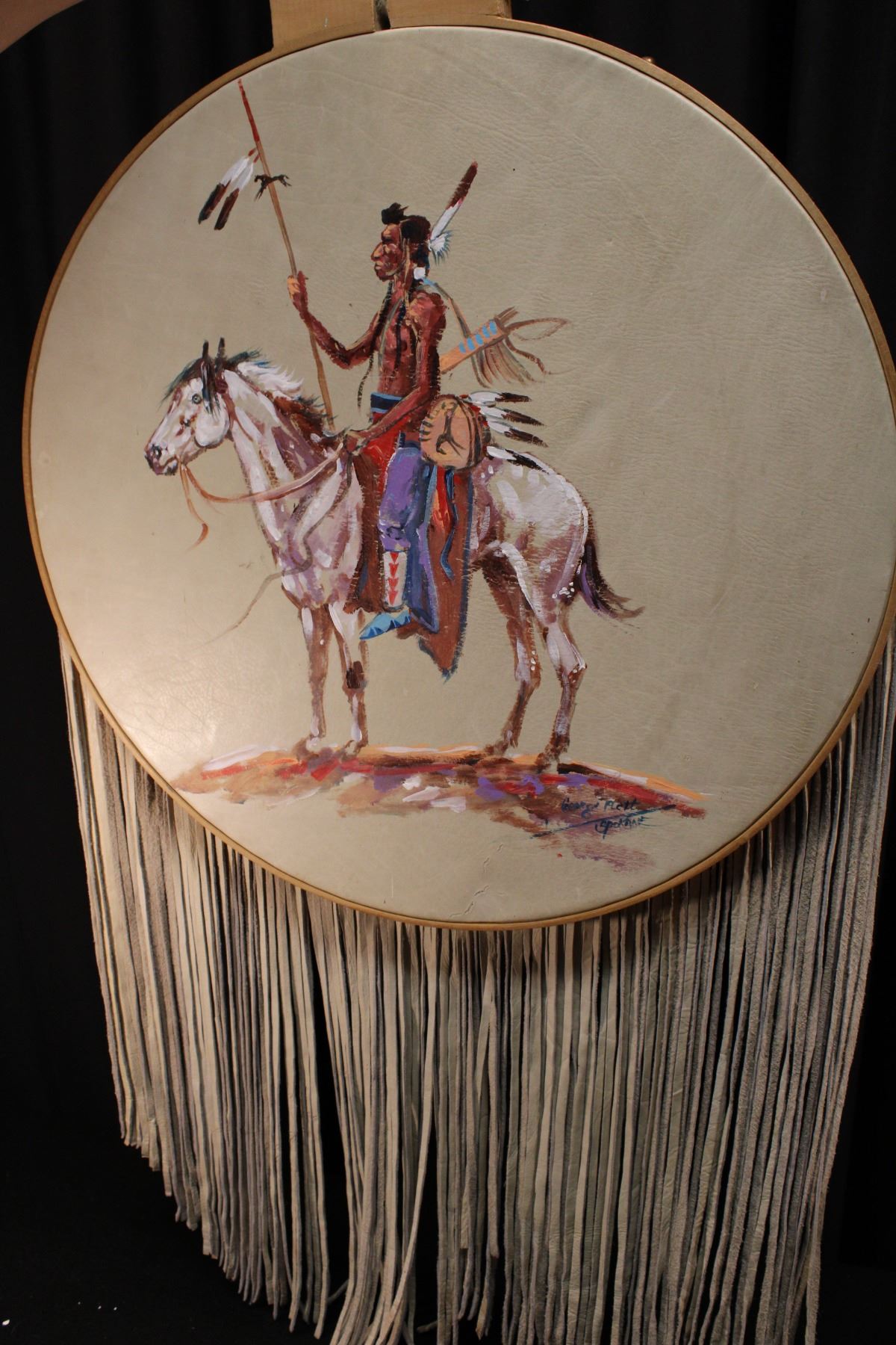 Painted hide of indian warrior. Original Spokane tribe. Late 20th century. 23" diameter