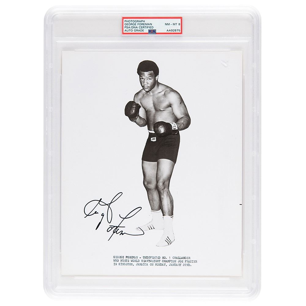Glossy 8 x 10 publicity photo of a young George Foreman standing in a full-length boxing pose, signed in black felt tip. In fine condition. Encapsulated and graded by PSA/DNA as "NM-MT 8."