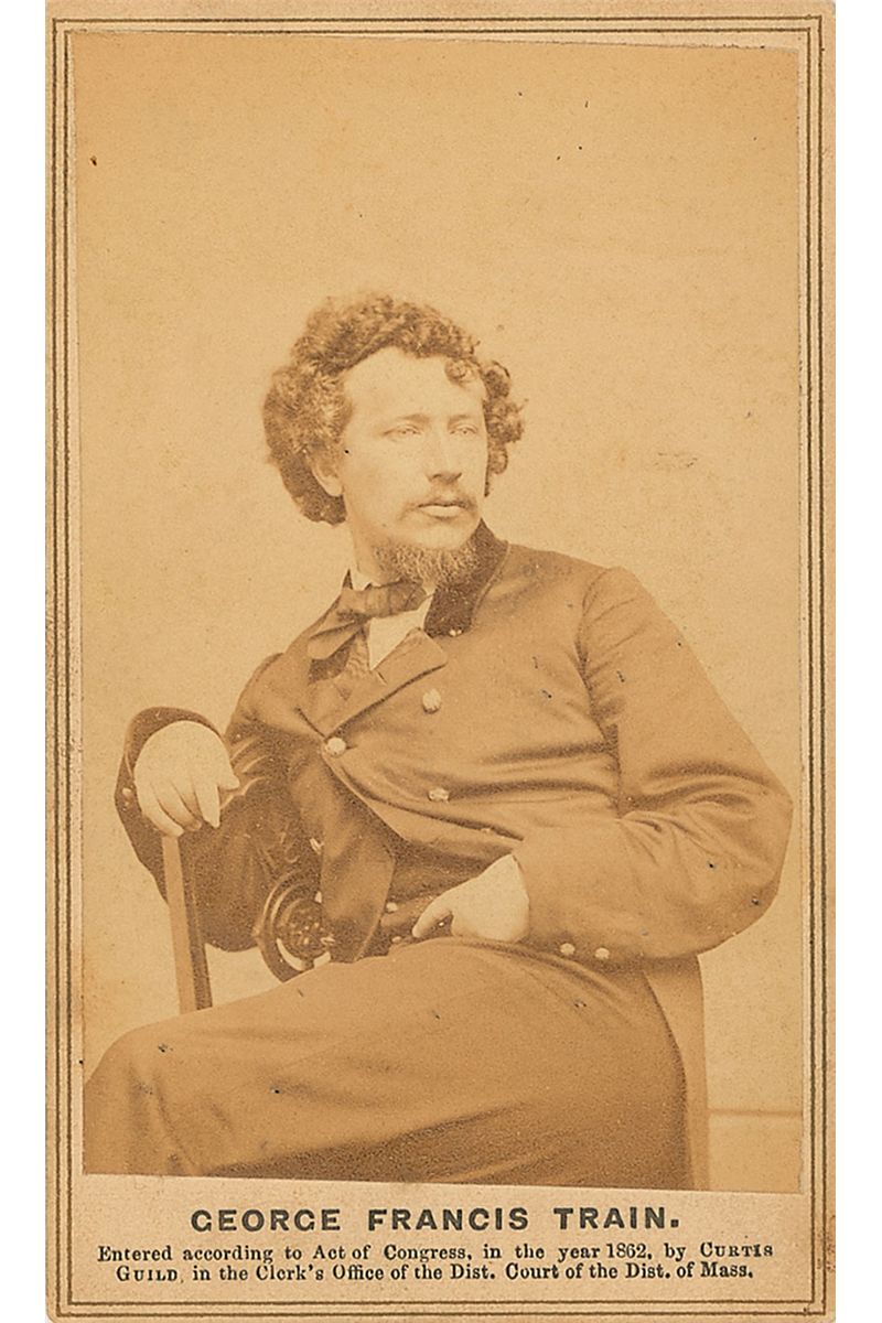 Eccentric American entrepreneur who helped organize the Union Pacific Railroad and circumnavigated the world three times (1829–1904). Original 2.25 x 4 carte-de-visite portrait of Train seated in a relaxed pose, signed and inscribed on the reverse in black ink, “J. F. Hart, Esq., with complts of Geo. Francis Train, God save the Union, and by America for the Americans.” Published by Silsbee, Case & Co. of Boston, bearing an 1862 copyright notice to the lower border. In fine condition.