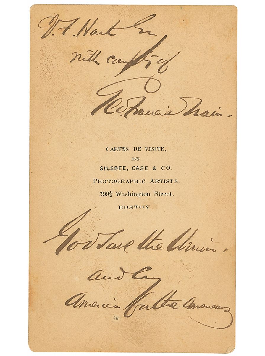 Eccentric American entrepreneur who helped organize the Union Pacific Railroad and circumnavigated the world three times (1829–1904). Original 2.25 x 4 carte-de-visite portrait of Train seated in a relaxed pose, signed and inscribed on the reverse in black ink, “J. F. Hart, Esq., with complts of Geo. Francis Train, God save the Union, and by America for the Americans.” Published by Silsbee, Case & Co. of Boston, bearing an 1862 copyright notice to the lower border. In fine condition.