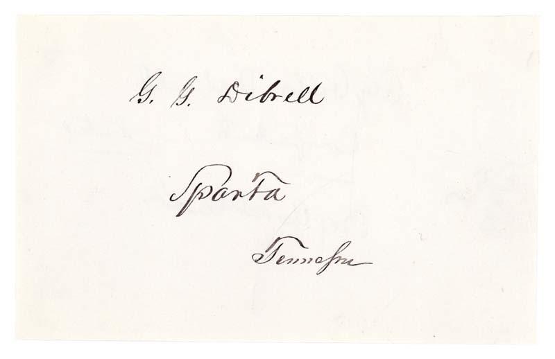 GEORGE G. DIBRELL (1822-1888) Confederate brigadier general who rose through the ranks after enlisting as private. He raised the 8th TN Cavalry behind Federal lines to operate as independent partisan Rangers and served with Forrest at Stones River. 5 1/2” x 3 1/2”. Signature, “G.G. Dibrell, Sparta, Tennessee”. Excellent.