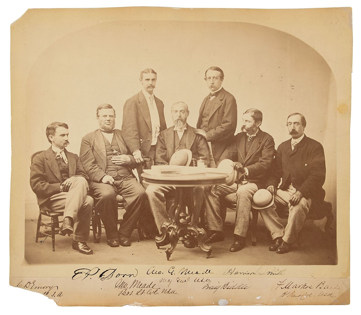 Vintage matte-finish 13 x 11.25 portrait of Major General George G. Meade posing with other veteran officers of the United States Army during a 1866 photography shoot taken in Boston, Massachusetts, signed in ink, "Geo G. Meade," as well as by the other men pictured, which includes: Campbell D. Emory, E. P. Dorr, George Meade, Jr., Craig Biddle, Harrison Smith, and Francis Markoe Bache. In very good to fine condition, with trimmed edges, loss to the lower edge and lower left corner (affecting one signature), and clear tape to the other three corners.