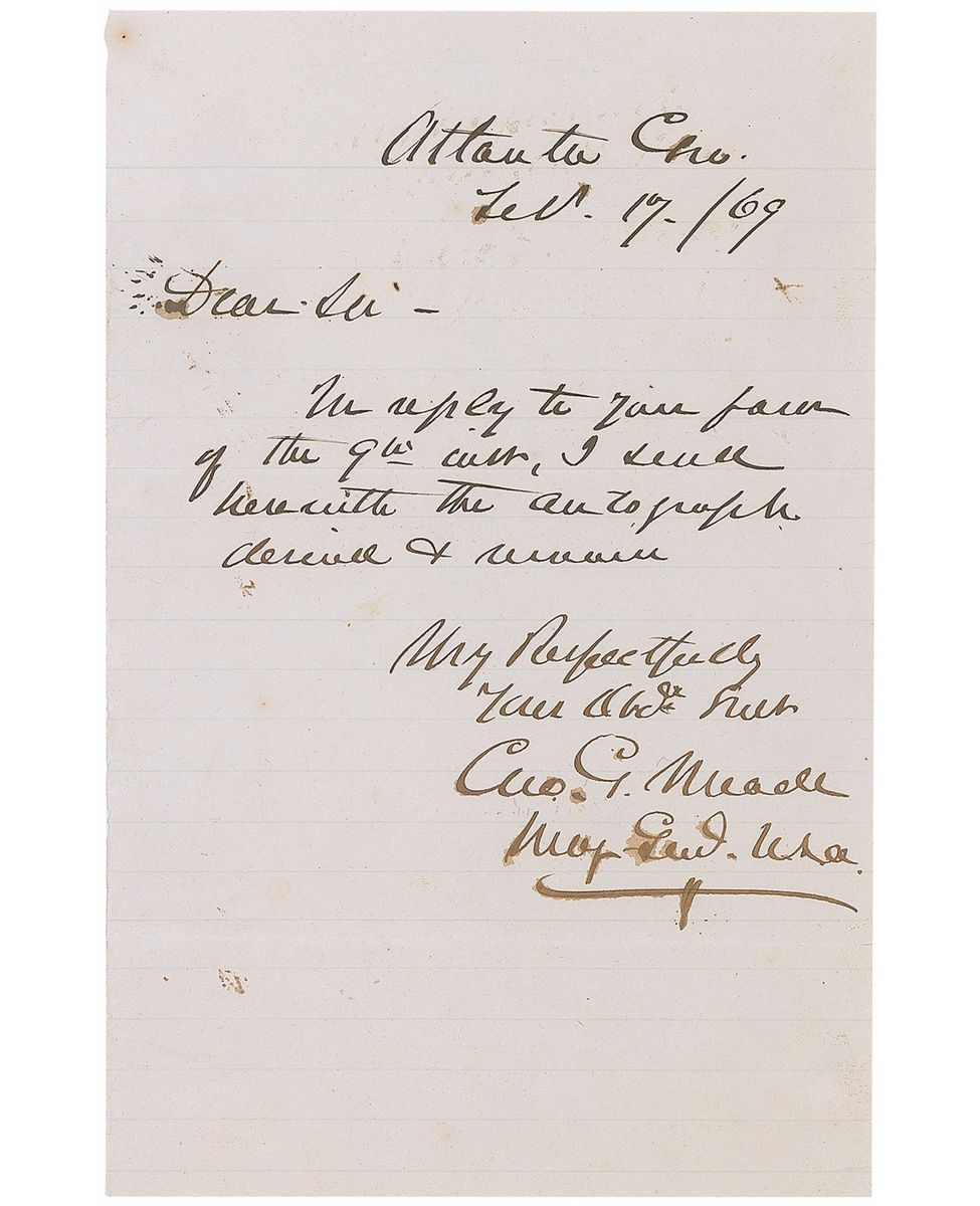 Union general (1815–1872) best known for leading his troops to a commanding victory over Lee’s Confederates at Gettysburg in one of the pivotal battles of the Civil War. ALS signed “Geo G. Meade, Maj. Genl. U.S.A.,” one page, lightly-lined, 5 x 7.75, February 17, 1869. Brief letter sending his autograph. In full: “In reply to your favor of the 9th inst, I send herewith the autograph desired.” In very good condition, with some mild rippling from mounting remnants on reverse, some stray ink marks, and a couple ink spots to Meade’s rank. Accompanied by an unsigned carte-de-visite by the Philadelphia Photographic Company, with trimmed corners.