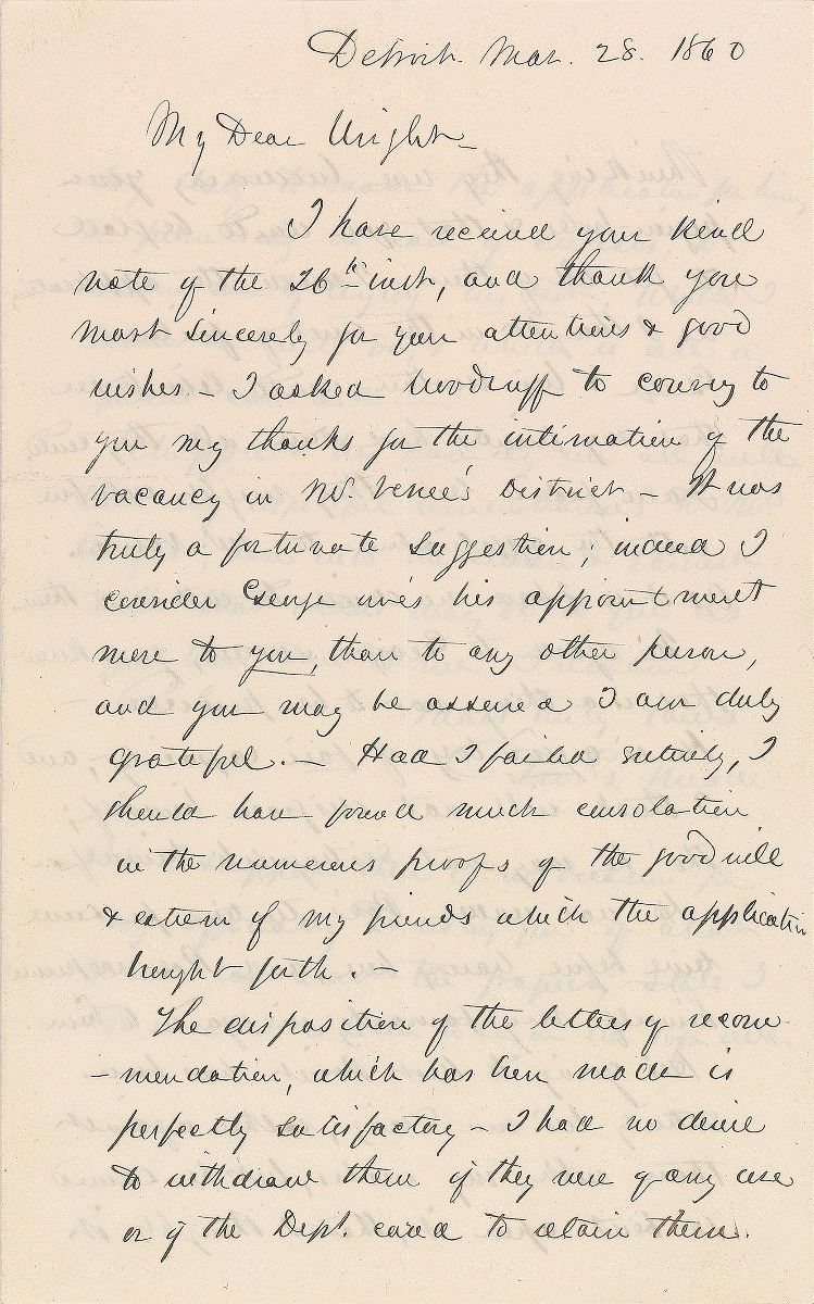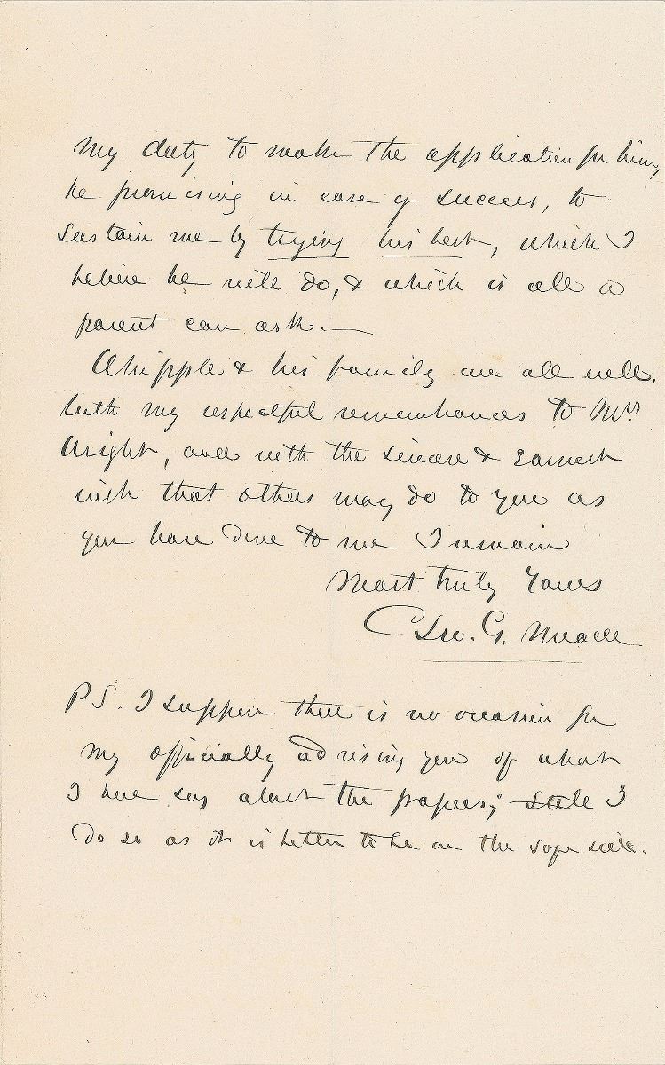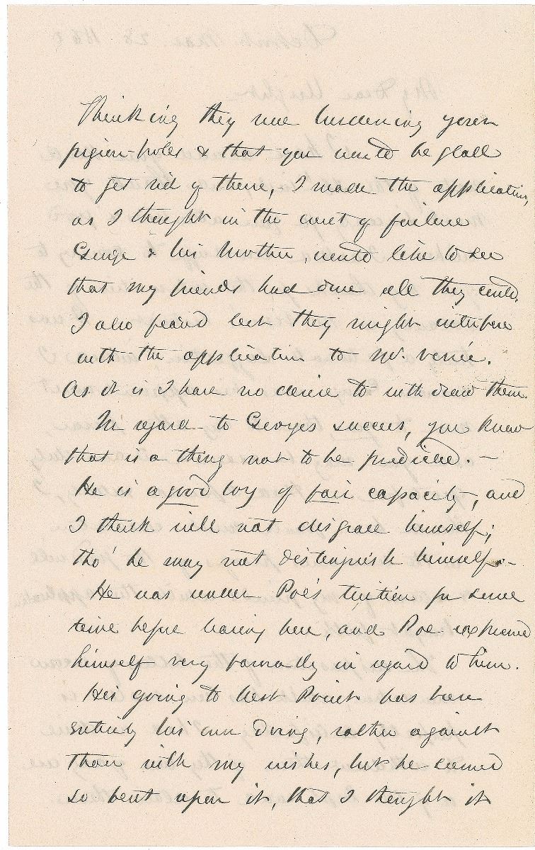 ALS signed “Geo. G. Meade,” three pages on two adjoining sheets, 5 x 8, March 28, 1860. Letter concerning his son. In part: “In regard to George’s success, you know that is a thing not to be predicted—He is a good boy of fair capacity, and I think will not disgrace himself; tho’ he may not distinguish himself…His going to West Point has been entirely his own doing, rather against than with my wishes, but he seemed so bent upon it, that I thought it my duty to make the application for him, he promising in case of success, to sustain me by trying his best, which I believe he will do, & which is all a parent can ask.” In fine condition. George G. Meade, Jr., entered West Point in 1860 but withdrew to join the Pennsylvania Volunteers in June 1862.