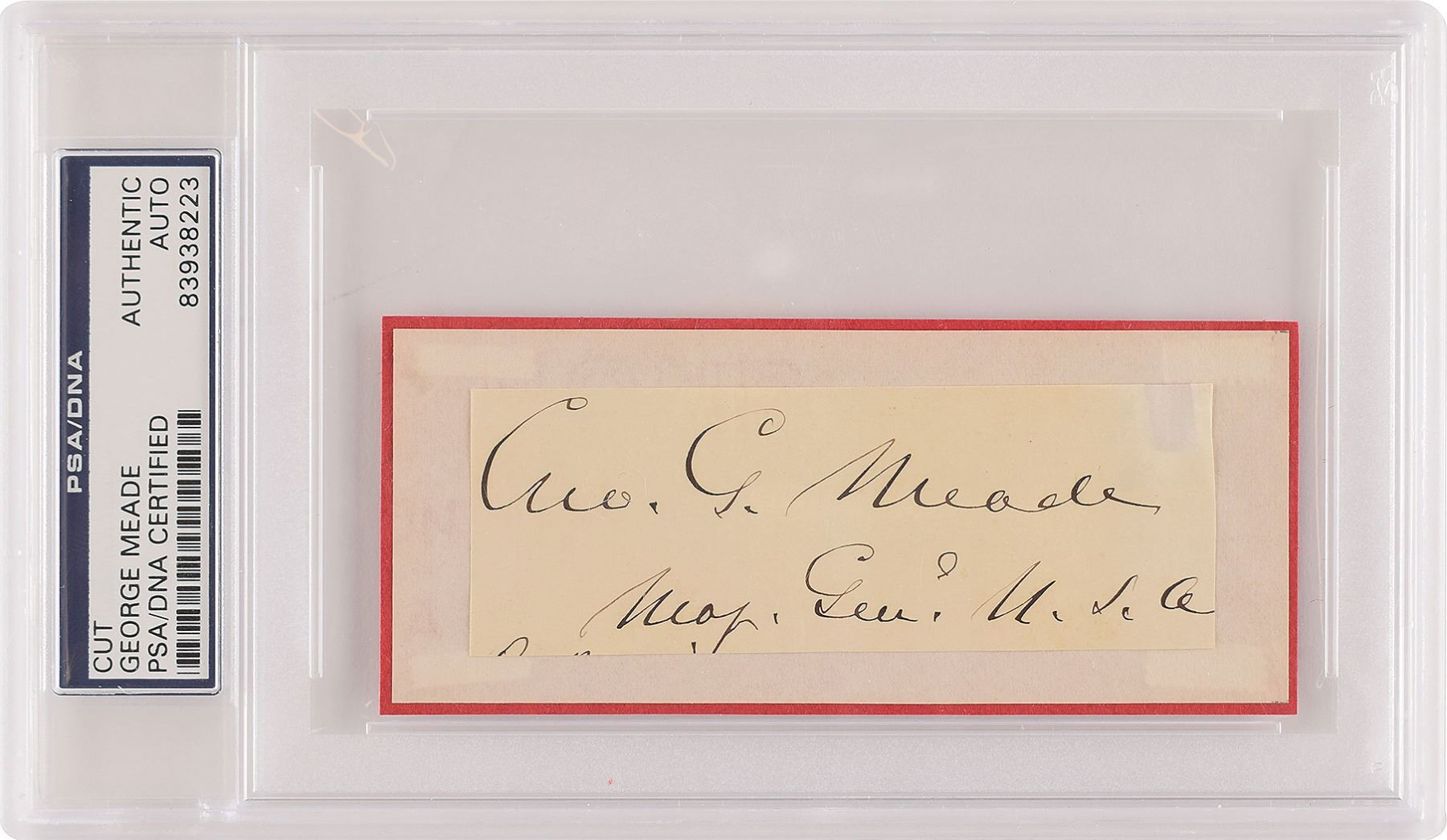 Large ink signature, "Geo. G. Meade, Maj. Gen'l U.S.A.,” on an off-white 3.75 x 1.25 slip affixed to a larger card. In fine condition, with a small area of discoloration to the upper right corner. Encapsulated in a PSA/DNA authentication holder.