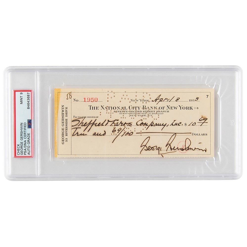 Personal check, 6.5 x 2.75, filled out and signed by George Gershwin, payable to Sheffield Farms Company, Inc. for $10.69, April 3, 1937. In fine condition, with a thin old tape stain along the left edge. Encapsulated in a PSA/DNA authentication holder, grading the autograph as "MINT 9."