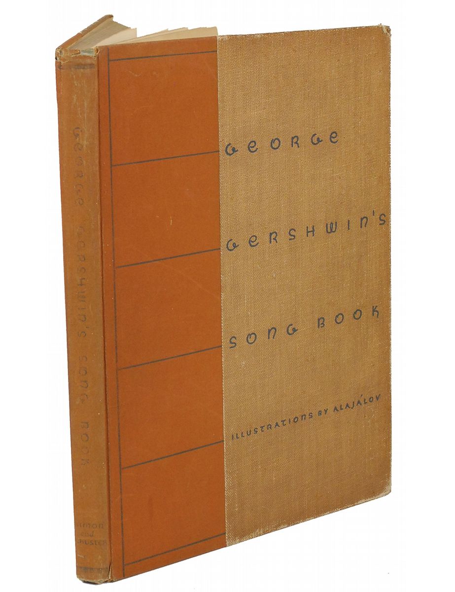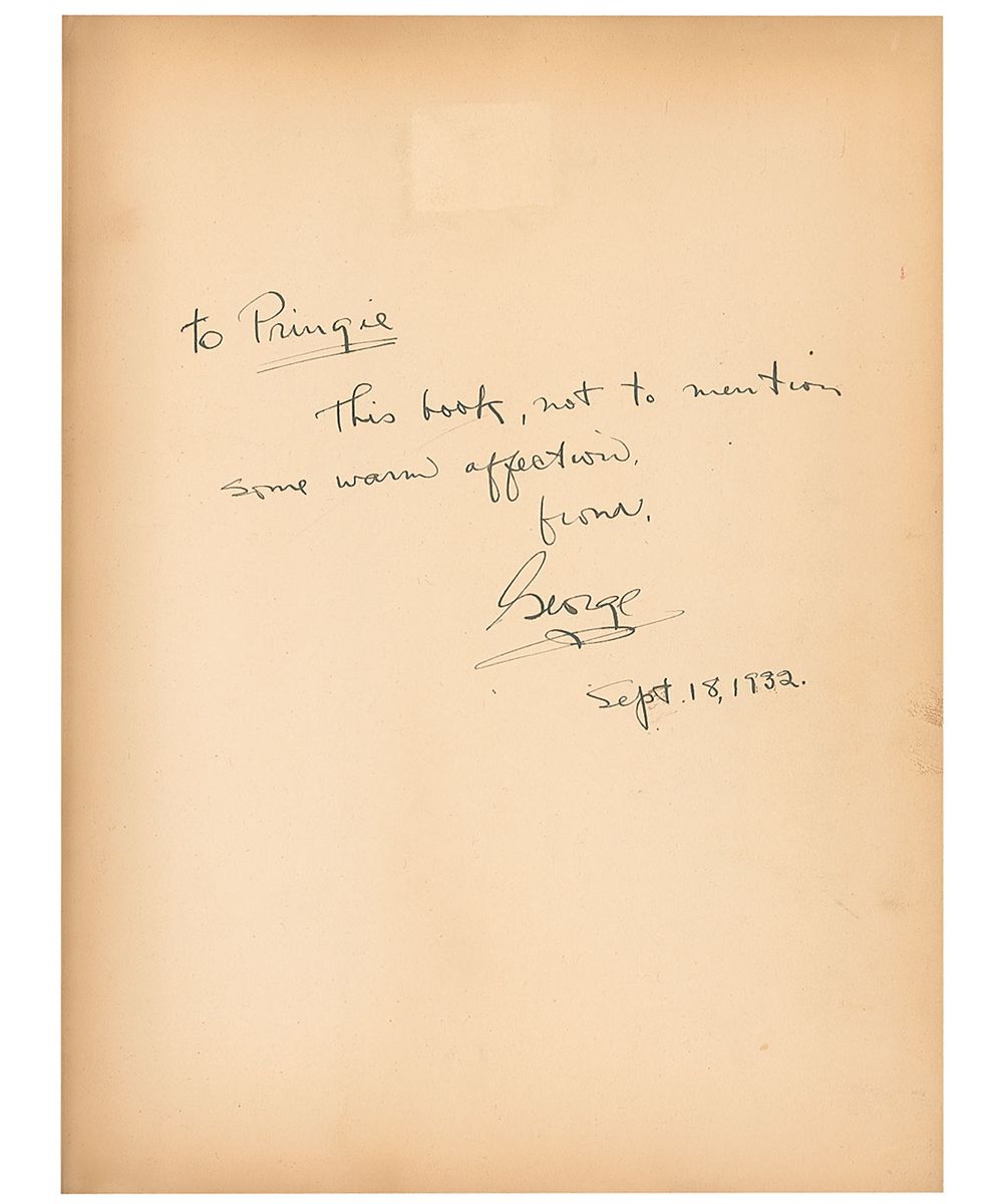 Signed book: George Gershwin’s Songbook. First edition. NY: Simon & Schuster, 1932. Hardcover, 9.75 x 12.75, 167 pages. Signed and inscribed in fountain pen on the first free end page to actress Aileen Pringle, “To Pringie, This book, not to mention some warm affection. From, George, Sept. 18, 1932.” Autographic condition: scattered toning to signed page, otherwise fine. Book condition: VG-/None. Two-tone brown cloth-covered boards; edges worn, with bumps at corners and several small tears in cloth; spine edges rubbed with a few minor splits; spine sunned; slightly shelf-cocked; minor soiling; textblock edges and endpapers discolored.