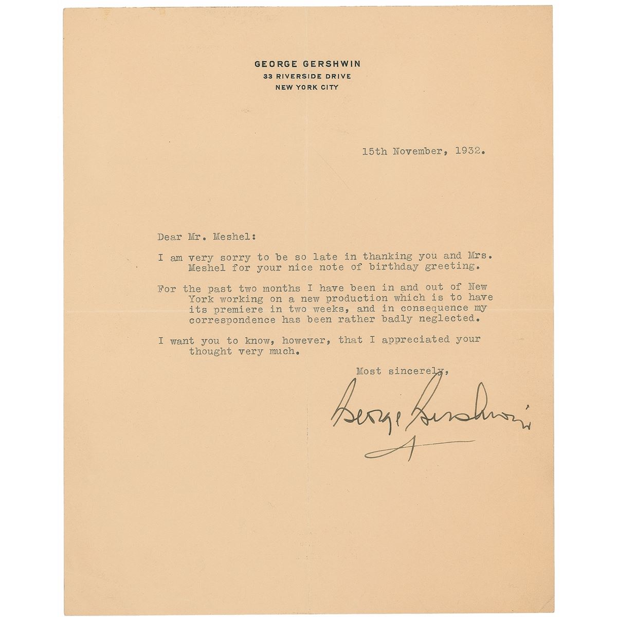 TLS, one page, 8.75 x 9.75, personal letterhead, November 15, 1932. Letter to Irving E. Meishel, sending a delayed thank-you for birthday wishes. In part: “For the past two months I have been in and out of New York working on a new production which is to have its premiere in two weeks, and in consequence my correspondence has been rather badly neglected.” In fine condition, with central vertical and horizontal folds. Gershwin must be referring to the musical Pardon My English, a farcical piece with a book by Herbert Fields and Morrie Ryskind, lyrics by Ira Gershwin, and music by George. It premiered in Philadelphia on December 2, 1932—just over two weeks after this letter—where it was panned by the critics. By the time of its Broadway premiere in January 1933 it was practically unrecognizable, with a rewritten plot, edits and additions to characters, and changes to the cast. Received poorly by critics and at the box office, Pardon My English ran for just 46 performances and has gone down in Broadway history as the shortest run for a Gershwin musical. Still, Gershwin’s score has stood the test of time and remains generally well-liked.