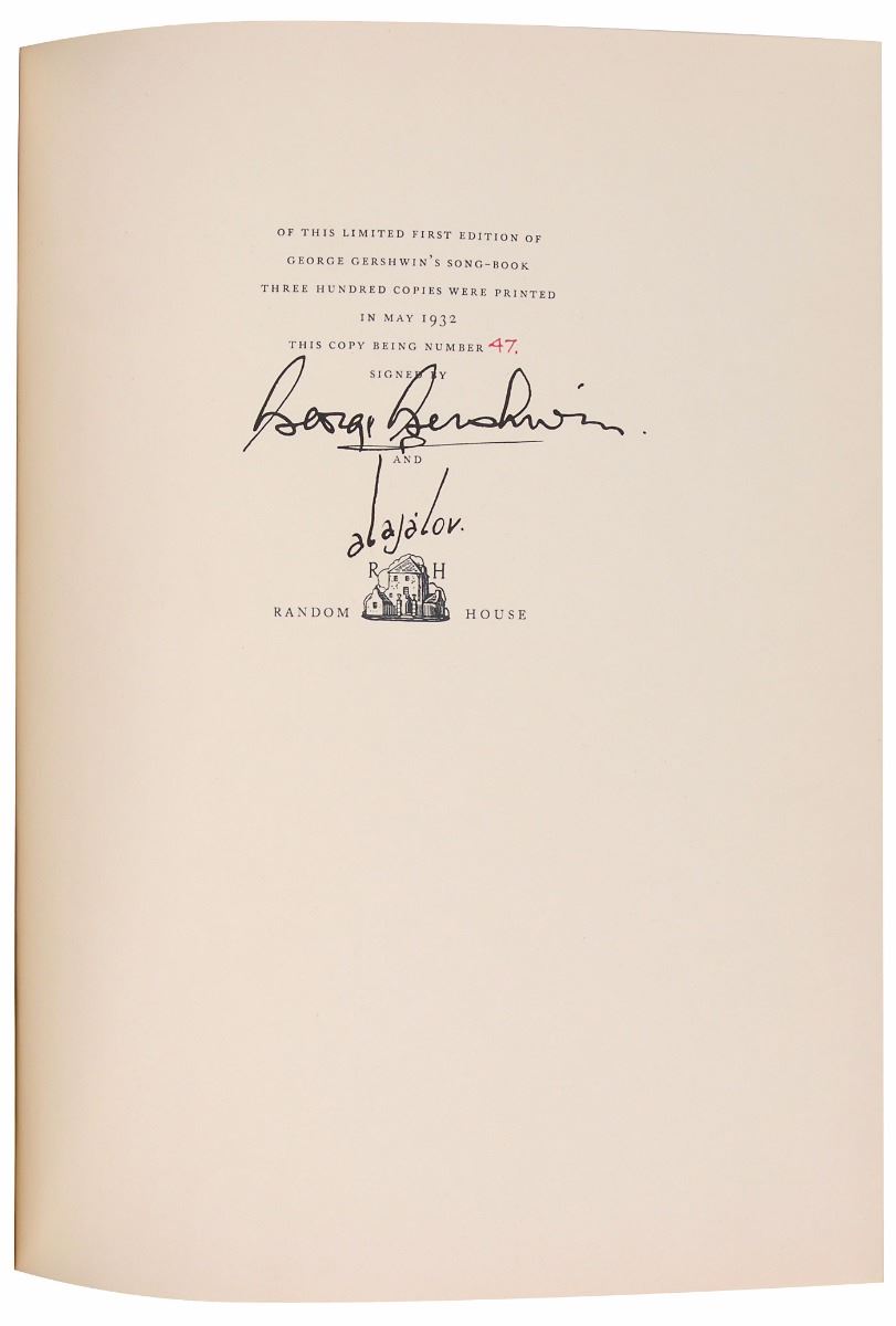 Signed book: George Gershwin’s Songbook. First edition, limited issue, numbered 47/300. NY: Random House, 1932. Hardcover, 9.75 x 13, 167 pages. Boldly signed on the colophon by the composer, George Gershwin, and the illustrator, Constantin Alajalov. Includes a separate unsigned booklet of sheet music, as issued, for Gershwin’s whimsical 1932 composition, ‘Mischa, Yascha, Toscha, Sascha.’ Autographic condition: very fine. Book condition: VG/None.