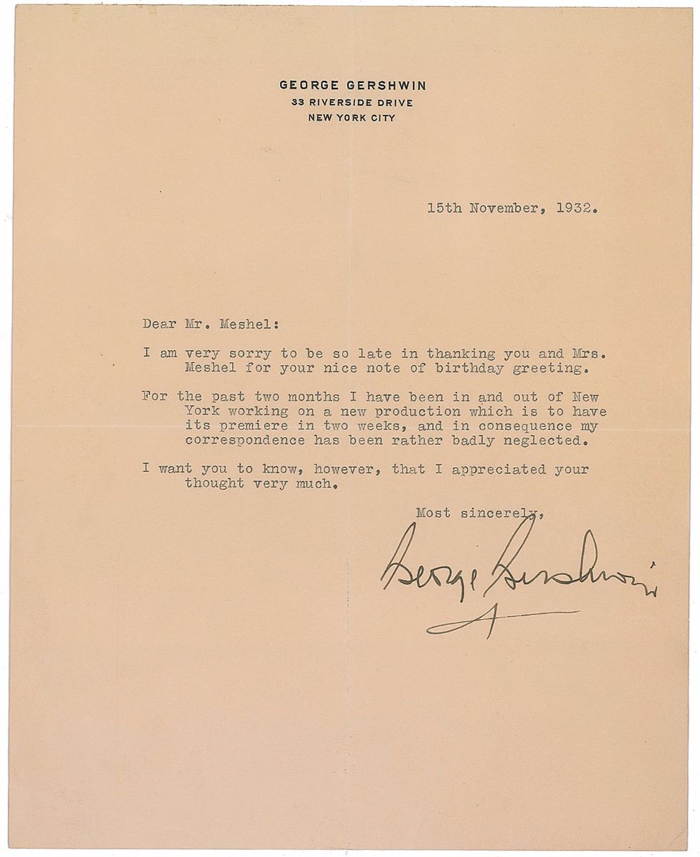 TLS, one page, 8.75 x 9.75, personal letterhead, November 15, 1932. Letter to Irving E. Meishel, sending a delayed thank-you for birthday wishes, in part: “For the past two months I have been in and out of New York working on a new production which is to have its premiere in two weeks, and in consequence my correspondence has been rather badly neglected.” In fine condition, with central vertical and horizontal folds. Gershwin must be referring to the musical Pardon My English, a farcical piece with a book by Herbert Fields and Morrie Ryskind, lyrics by Ira Gershwin, and music by George. It premiered in Philadelphia on December 2, 1932—just over two weeks after this letter—where it was panned by the critics. By the time of its Broadway premiere in January 1933 it was practically unrecognizable, with a rewritten plot, edits and additions to characters, and changes to the cast. Received poorly by critics and at the box office, Pardon My English ran for just 46 performances and has gone down in Broadway history as the shortest run for a Gershwin musical. Still, Gershwin’s score has stood the test of time and remains generally well-liked.