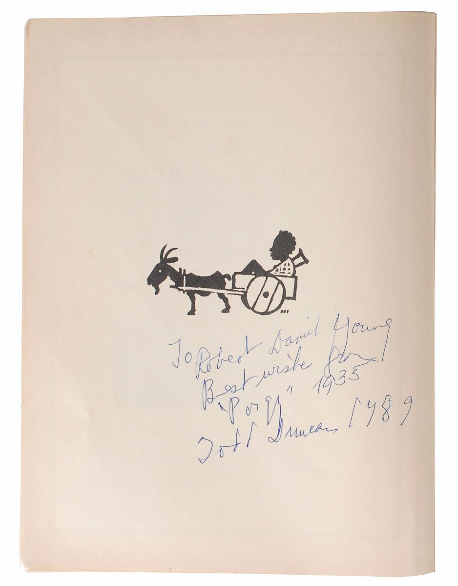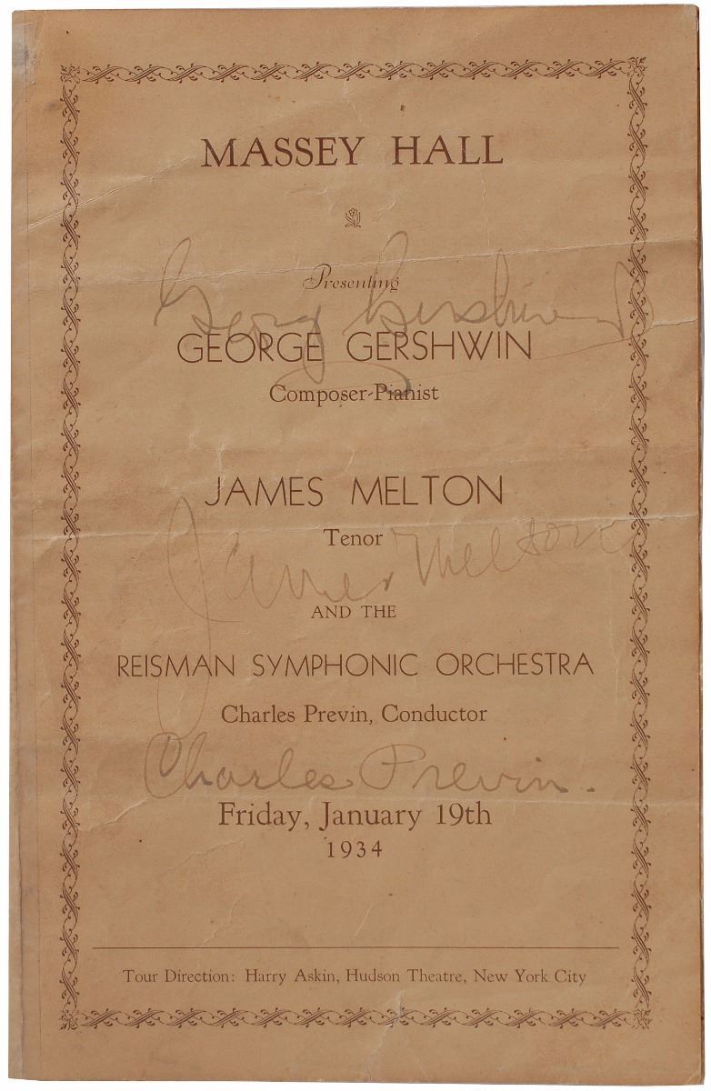 Program for Gershwin’s performance with James Melton and the Reiman Symphonic Orchestra on January 19, 1934, two pages, 5.5 x 8.5, signed on the front cover in fountain pen by pianist-composer George Gershwin, tenor James Melton, and conductor Charles Previn. In very good condition, with tape reinforcement along hinge. Accompanied by an unsigned program for a Gershwin concert tour and a score for Porgy and Bess inscribed inside by baritone singer Todd Duncan, the first performer of the role of Porgy.
