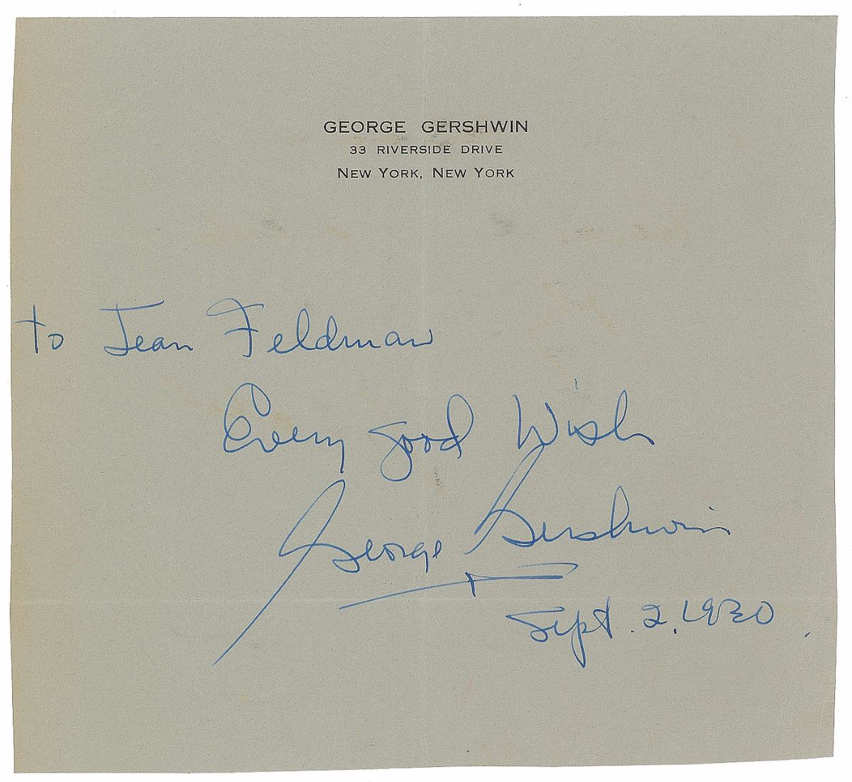 Blue ink signature and inscription, “To Jean Feldman, Every good wish, George Gershwin, Sept. 2, 1930” on an off-white 7.5 x 7 trimmed sheet of personal letterhead. In very good to fine condition, with intersecting folds and old mounting remnants on the reverse.