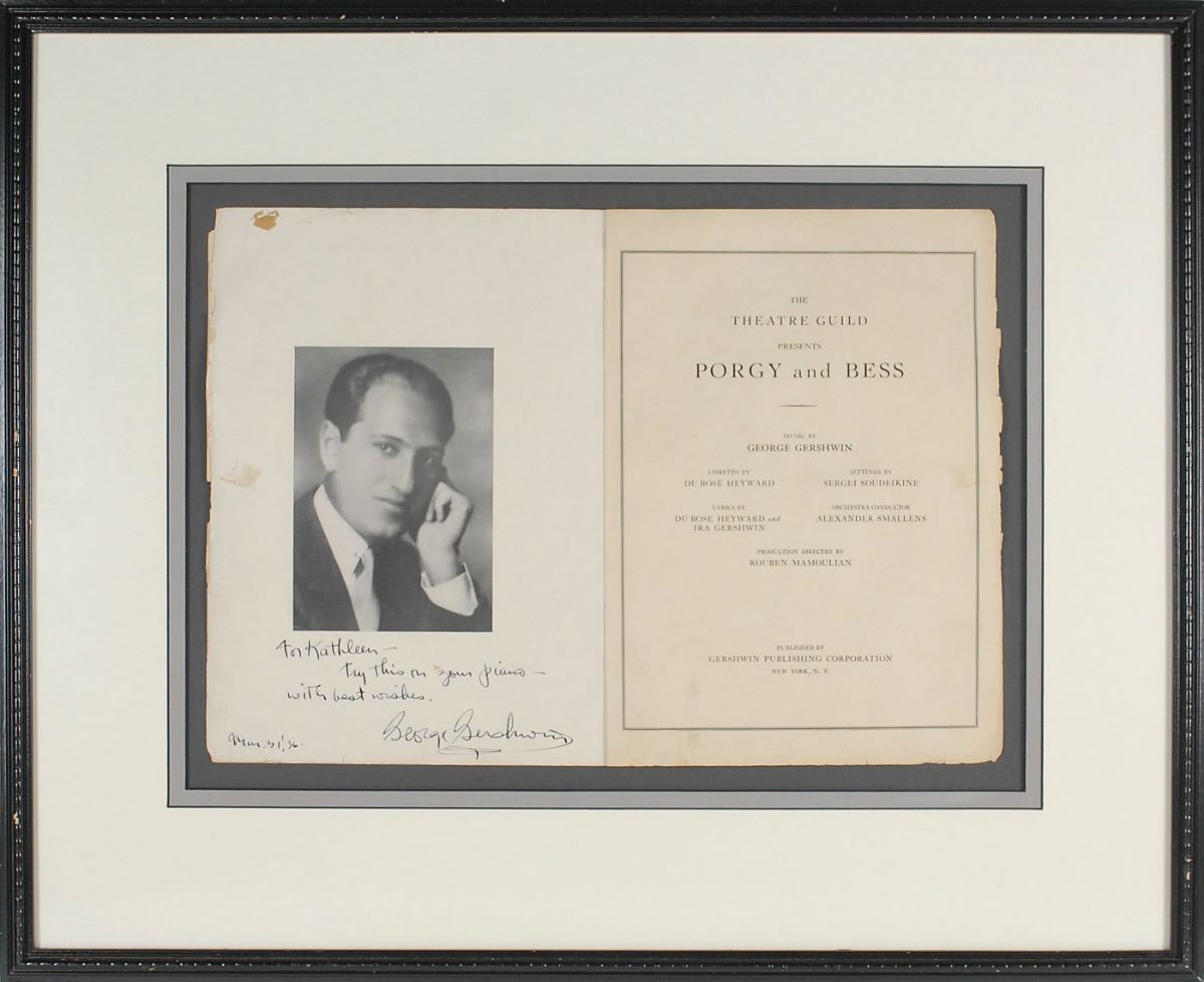 Scarce and highly desirable cover and title page for sheet music to Porgy and Bess, measuring 17 x 11.75 open, signed below his frontispiece image in fountain pen, “For Kathleen—Try this on your piano—with best wishes, George Gershwin, Mar. 31, ’36.” Attractively double-matted and framed to an overall size of 25.75 x 21. In very good to fine condition, with a few small stains and chipping to edges. Oversized.