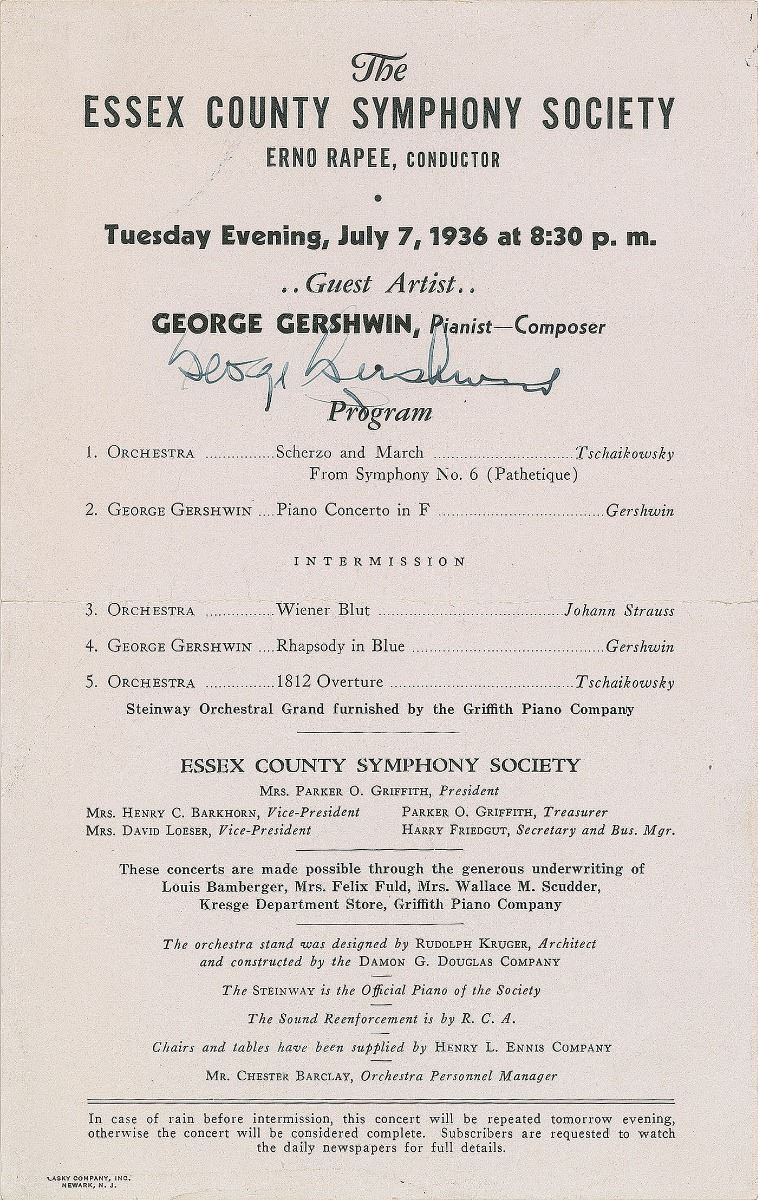 Essex County Symphony Society program for a special guest performance by Gershwin in Newark, New Jersey, on July 7, 1936, measures 6 x 9.5, signed in fountain pen by Gershwin. The first half of the concert includes “Piano Concerto in F,” with the second half listing “Rhapsody in Blue.” In fine condition.