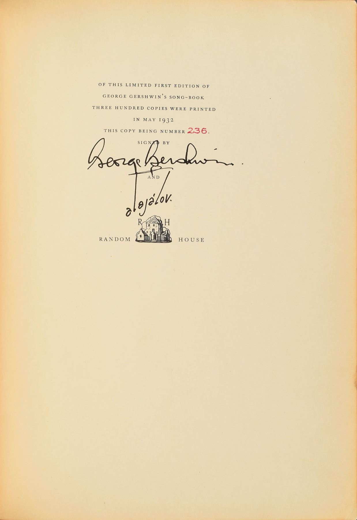 Signed book: George Gershwin’s Song-Book. First edition, limited issue, numbered 236/300. NY: Random House, 1932. Hardcover, 9.75 x 13, 167 pages. Boldly signed on the colophon by the composer, George Gershwin, and the illustrator, Constantin Alajalov. Autographic condition: fine. Book condition: VG/None, with professional repairs to the spine and edges of the boards.