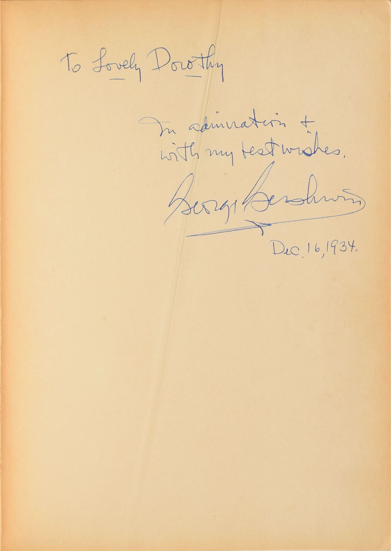 Gershwin presented this volume to Heyward while they were working together on the iconic opera Porgy and Bess. Dorothy Heyward had co-authored the play Porgy with her husband, DuBose Heyward, adapted from his 1927 novel of the same name. The play then served as the basis of the libretto for Porgy and Bess, which is by far the most well-known iteration of the work. Gershwin and Heyward worked on the opera together throughout 1934 and 1935. Conceived as an 'American folk opera,' Porgy and Bess made its premiere on September 30, 1935, at the Colonial Theatre in Boston. A superb association piece connecting two great figures in the American arts.