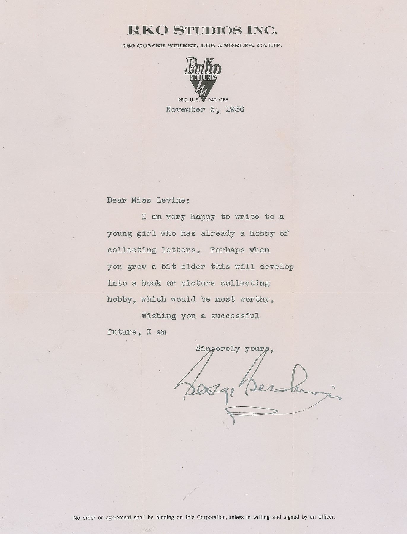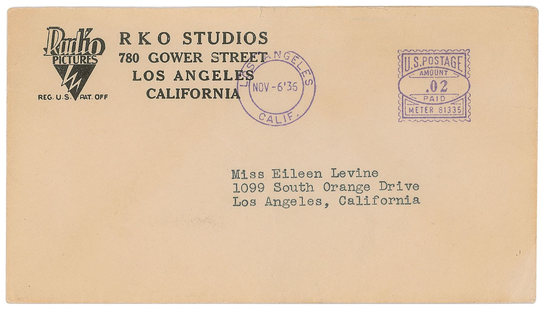 TLS, one page, 8.5 x 11, RKO Studios, Inc. letterhead, November 5, 1936. Letter to a young autograph collector, in part: "I am very happy to write to a young girl who has already a hobby of collecting letters. Perhaps when you grow a bit older this will develop into a book or picture collecting hobby, which would be most worthy." In fine condition. Accompanied by the original mailing envelope.