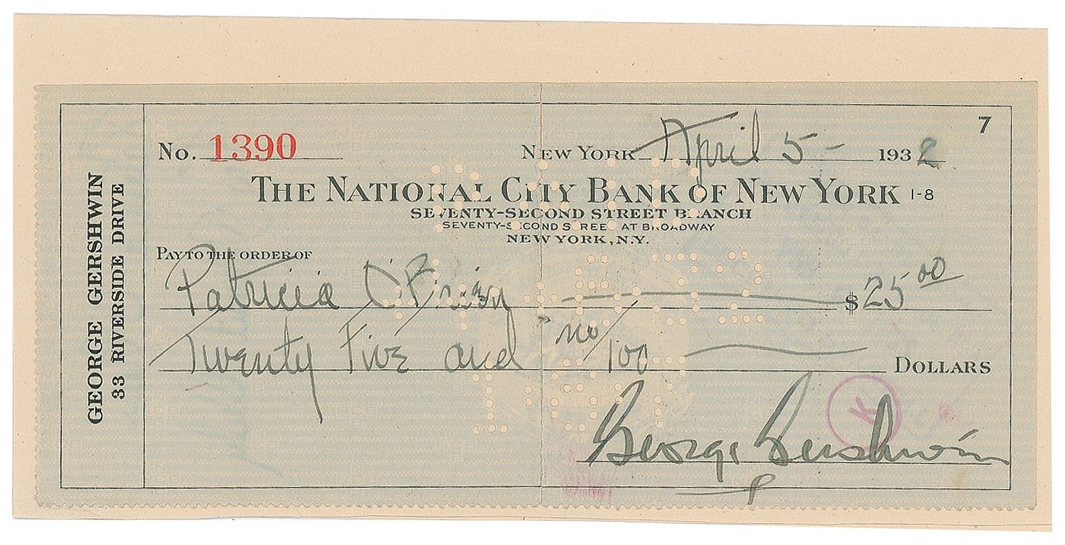 Personal check, 6.5 x 2.75, filled out in another hand and signed by Gershwin, "George Gershwin," payable to Patricia O'Brien for $25, April 5, 1932. In fine condition.