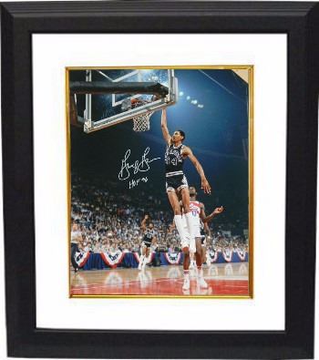 San Antonio Spurs' star George Gervin is the first guard in the history of the NBA to score three scoring titles in a row. While only Wilt Chamberlain and Michael Jordan have won the scoring title more than Gervin's four. Gervin, who was elected to the basketball Hall of Fame in 1996, averaged 26.2 points per game and scored 26,595 career points between the ABA and the NBA. His scoring proficiency is only furthered by the fact he scored in double figures a record 407 games in a row. George Gervin has hand signed this 8x10 Photo with HOF 96 inscription. Schwartz Sports Hologram and Certificate of Authenticity from Athlon Sports. Custom White Mat and Black Framed as shown.
