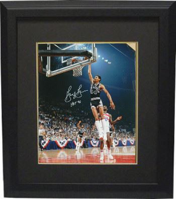 San Antonio Spurs' star George Gervin is the first guard in the history of the NBA to score three scoring titles in a row. While only Wilt Chamberlain and Michael Jordan have won the scoring title more than Gervin's four. Gervin, who was elected to the basketball Hall of Fame in 1996, averaged 26.2 points per game and scored 26,595 career points between the ABA and the NBA. His scoring proficiency is only furthered by the fact he scored in double figures a record 407 games in a row. George Gervin has hand signed this 8x10 Photo with HOF 96 inscription. Schwartz Sports Hologram and Certificate of Authenticity from Athlon Sports. Custom Black Mat and Black Framed as shown.