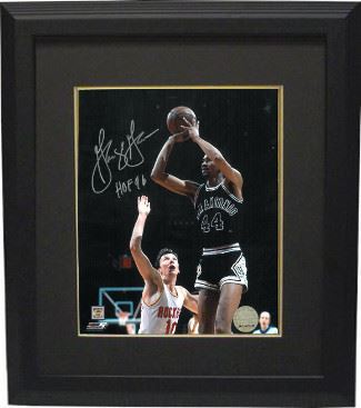 San Antonio Spurs' star George Gervin is the first guard in the history of the NBA to score three scoring titles in a row. While only Wilt Chamberlain and Michael Jordan have won the scoring title more than Gervin's four. Gervin, who was elected to the basketball Hall of Fame in 1996, averaged 26.2 points per game and scored 26,595 career points between the ABA and the NBA. His scoring proficiency is only furthered by the fact he scored in double figures a record 407 games in a row. George Gervin has hand signed this 8x10 Photo with HOF 96 inscription. Certificate of Authenticity from Athlon Sports. Custom Black Mat and Premium Black Color Framed as shown