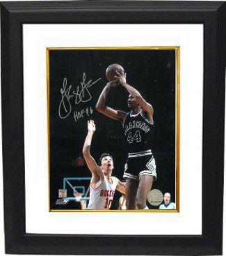 San Antonio Spurs' star George Gervin is the first guard in the history of the NBA to score three scoring titles in a row. While only Wilt Chamberlain and Michael Jordan have won the scoring title more than Gervin's four. Gervin, who was elected to the basketball Hall of Fame in 1996, averaged 26.2 points per game and scored 26,595 career points between the ABA and the NBA. His scoring proficiency is only furthered by the fact he scored in double figures a record 407 games in a row. George Gervin has hand signed this 8x10 Photo with HOF 96 inscription. Certificate of Authenticity from Athlon Sports. Custom White Mat and Premium Black Color Framed as shown