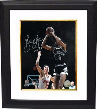 San Antonio Spurs' star George Gervin is the first guard in the history of the NBA to score three scoring titles in a row. While only Wilt Chamberlain and Michael Jordan have won the scoring title more than Gervin's four. Gervin, who was elected to the basketball Hall of Fame in 1996, averaged 26.2 points per game and scored 26,595 career points between the ABA and the NBA. His scoring proficiency is only furthered by the fact he scored in double figures a record 407 games in a row. George Gervin has hand signed this 8x10 Photo with ICE inscription. Certificate of Authenticity from Athlon Sports. Custom White Mat and Premium Black Color Framed as shown