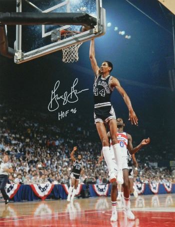 San Antonio Spurs' star George Gervin is the first guard in the history of the NBA to score three scoring titles in a row. While only Wilt Chamberlain and Michael Jordan have won the scoring title more than Gervin's four. Gervin, who was elected to the basketball Hall of Fame in 1996, averaged 26.2 points per game and scored 26,595 career points between the ABA and the NBA. His scoring proficiency is only furthered by the fact he scored in double figures a record 407 games in a row. George Gervin has hand signed this 8x10 Photo with HOF 96 inscription. Schwartz Sports Hologram and Certificate of Authenticity from Athlon Sports.