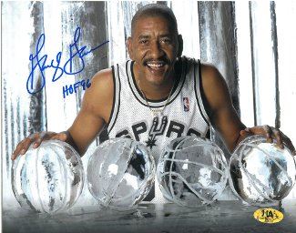 San Antonio Spurs' star George Gervin is the first guard in the history of the NBA to score three scoring titles in a row. While only Wilt Chamberlain and Michael Jordan have won the scoring title more than Gervin's four. Gervin, who was elected to the basketball Hall of Fame in 1996, averaged 26.2 points per game and scored 26,595 career points between the ABA and the NBA. His scoring proficiency is only furthered by the fact he scored in double figures a record 407 games in a row. George Gervin has hand signed this 8X10 Photo with ICE Trophies with HOF 96 inscription. MAB Hologram and Certificate of Authenticity from Athlon Sports.