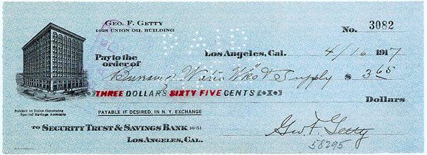 George Getty. DS. 1pp. 8 3/4" x 3". Los Angeles. June 12, 1917. A "Security Trust and Savings Bank" check signed by George Getty. He paid "N.A. Larson $8.00". The check is stamp and punch cancelled with a dark signature; it is in very fine condition.