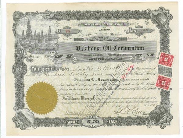 George Getty. DS. 1pp. 10 3/4" x 8 1/4". Arizona. June 28 1921. An "Oklahoma Oil Corporation" stock signed by George Getty as president. It is for 100 shares. There is a receipt glued to the left edge that covers a gold corporate seal and a vignette of an oil field. Stamp cancelled and in very fine condition overall.