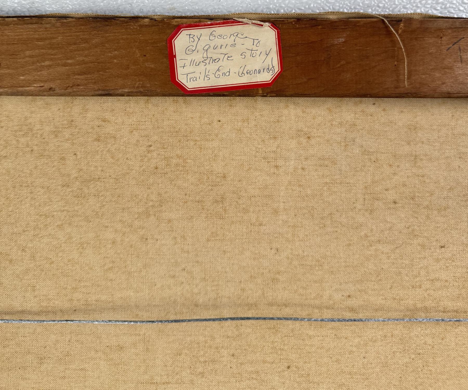 Title is Trail's End. Painting measures 29" by 31". Oil on Canvas. Illustrated for the book cover of Trail's End by William MacLeod Raine. A volume of this book is included with the sale. George Giguere (20th century) was active/lived in New York. George Giguere is known for Illustrator, war-western genre. Like so many very fine artists from the golden age of illustration, there is little documentation about George Giguere’s career. He is listed as having flourished in New York from 1917 to 1953, and as having worked for, among others, The Saturday Evening Post, Boy’s Life, McClure’s, and The American Magazine.