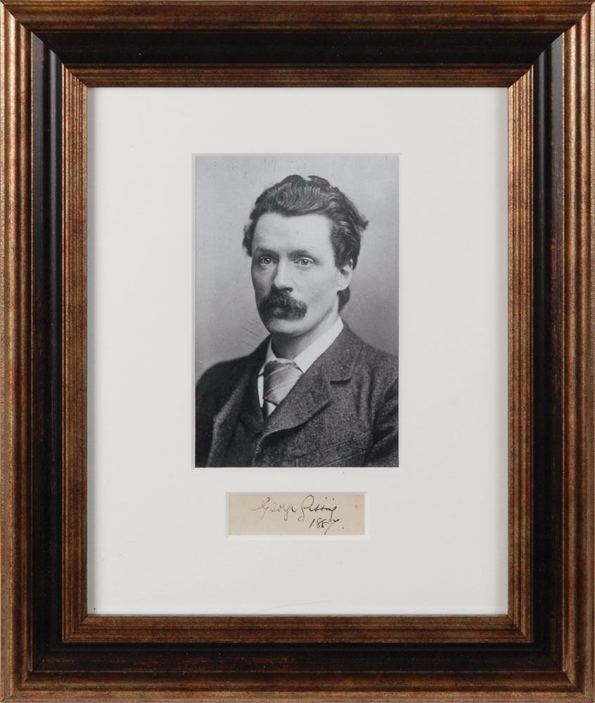 Influential English writer (1857–1903) known for his realist novels about the lower middle class; George Orwell was one of Gissing's greatest admirers, calling him 'perhaps the best novelist England has produced.' Scarce ink signature, "George Gissing," on an off-white slip, matted and framed with a portrait to an overall size of 11 x 13. In fine condition.
