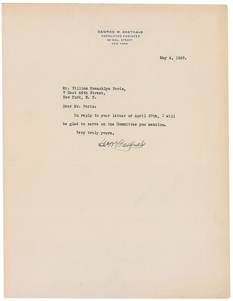 Army officer and civil engineer (1858–1928) appointed by Theodore Roosevelt to oversee the construction of the Panama Canal. TLS signed “Geo. W. Goethals,” one page, 8.5 x 11, personal letterhead, May 4, 1927. Letter to author and artist William Francklyn Paris. In full: “In reply to your letter of April 27th, I will be glad to serve on the Committee you mention.” In fine condition, with intersecting folds and light toning to the edges.